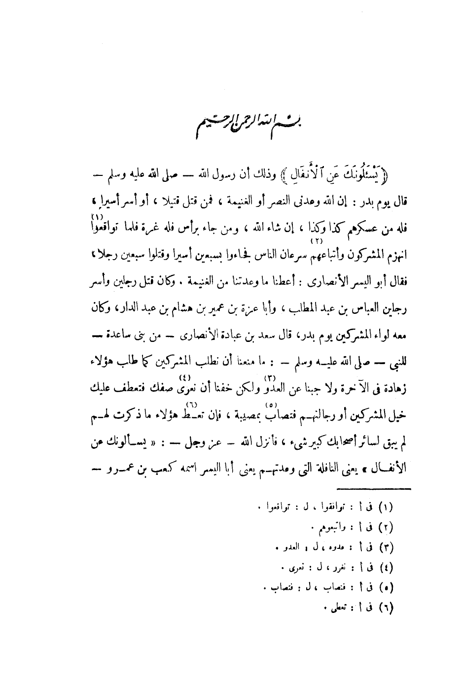 أن رسول الله- صلى الله عليه وسلم- قال يوم بدر: إن الله وعدني النصر أو الغنيمة، فمن قتل قتيلا، أو أسر أسيرا» فله من عسكرهم كذا وكذا، إن شاء الله، ومن جاء برأس فله غرة فلما تواقعوا «1» انهزم المشركون وأتباعهم «2» سرعان الناس فجاءوا بسبعين أسيرا وقتلوا سبعين رجلا، فقال أبو اليسر الأنصاري: أعطنا ما وعدتنا من الغنيمة. وكان قتل رجلين وأسر رجلين العباس بن عبد المطلب، وأبا عزة بن عمير بن هشام بن عبد الدار، وكان معه لواء المشركين يوم بدر، قال سعد بن عبادة الأنصاري- من بنى ساعدة- للنبي- صلى الله عليه وسلم-: ما مَنَعَنا أن نطلب المشركين كما طلب هؤلاء زهادةٌ فى الآخرة ولا جبنا عن العدو «3» ولكن خفنا أن نعري «4» صفك فتعطف عليك خيل المشركين أو رجالاتهم فتصاب «5» بمصيبة، فإن تعط «6» هؤلاء ما ذكرت لهم لم يبق لسائر أصحابك كبير شيء، فأنزل الله- عز وجل-: «يَسْئَلُونَكَ عَنِ الْأَنْفالِ»