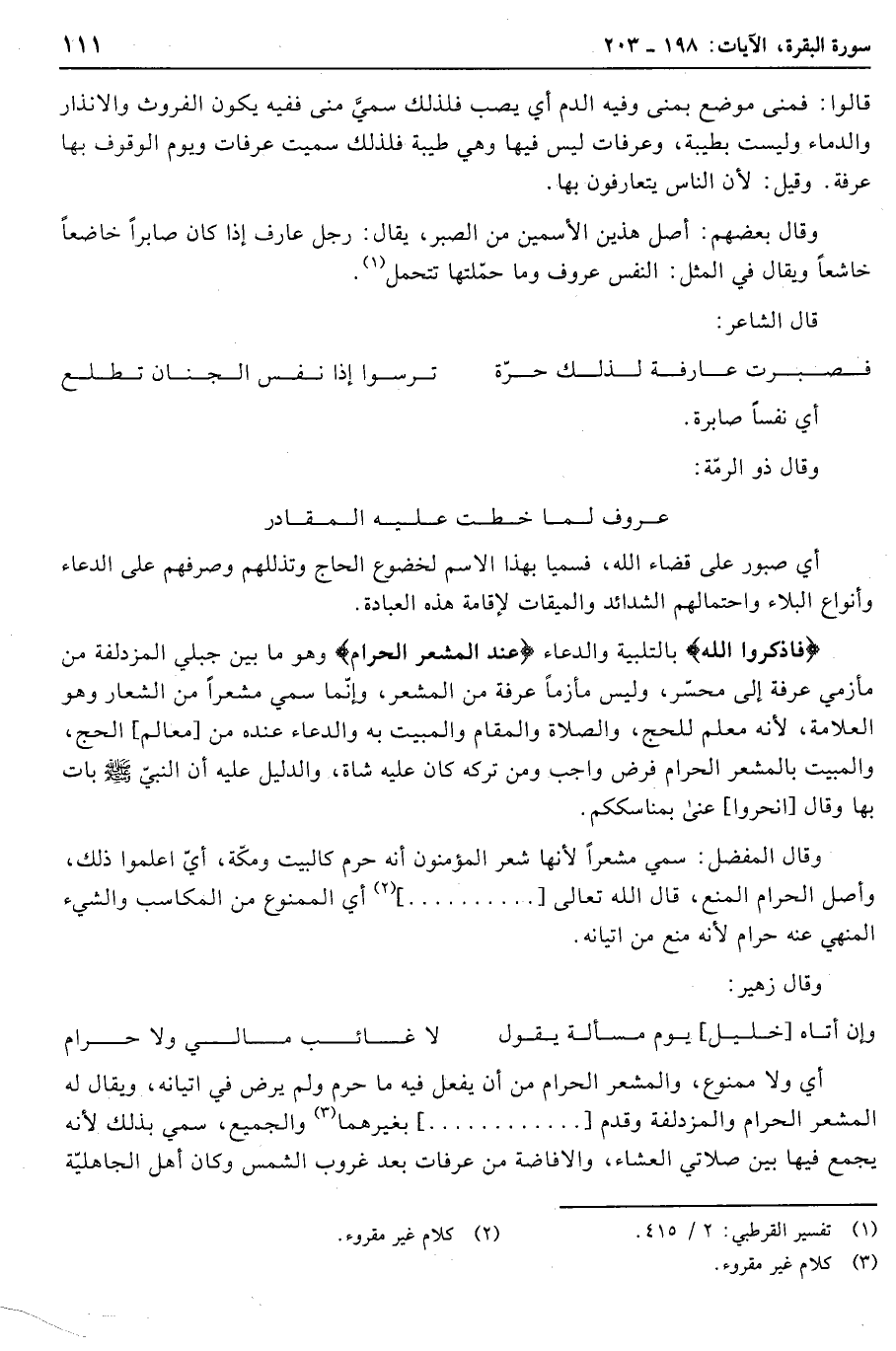 أي ولا ممنوع، والمشعر الحرام من أن يفعل فيه ما حرم ولم يرض في إتيانه، ويقال له المشعر الحرام والمزدلفة وقدم [ ... ] بغيرهما «3» والجميع، سمي بذلك لأنه يجمع فيها بين صلاتي العشاء، والافاضة من عرفات بعد غروب الشمس وكان أهل الجاهليّة