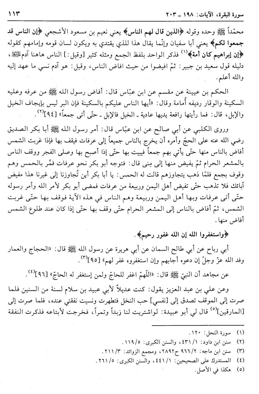 وروى الكلبي عن أبي صالح عن ابن عبّاس قال: أمر رسول الله صلّى الله عليه وسلّم أبا بكر الصديق رضي الله عنه على الحجّ وأمره أن يخرج بالناس جميعا إلى عرفات فيقف بها فإذا غربت الشمس أفاض بالناس منها حتّى يأتي بهم جمعا فيبيت بها حتّى إذا أصبح بها وصلّى الفجر ووقف الناس بالمشعر الحرام ثمّ يفيض منها إلى منى قال: فتوجه أبو بكر نحو عرفات فمرّ بالحمس وهم وقوف بجمع فلمّا ذهب يتجاوزهم قالت له الحمس: يا أبا بكر أين تجاوزنا إلى غيرنا هذا مفيض آبائك فلا تذهب حتّى تفيض أهل اليمن وربيعة من عرفات فمضى أبو بكر لأمر الله وأمر رسوله حتّى أتى عرفات وبها أهل اليمن وربيعة وهم الناس في هذه الآية فوقف بها حتّى غربت الشمس، ثمّ أفاض بالناس إلى المشعر الحرام حتّى وقف بها حتّى إذا كان عند طلوع الشمس أفاض منها.