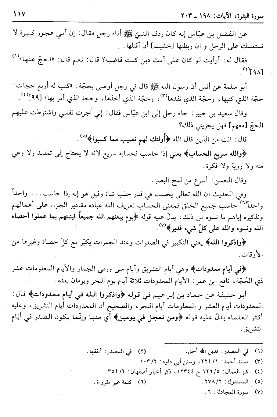 فِي أَيَّامٍ مَعْدُوداتٍ وهي أيام التشريق وأيام منى ورمي الجمار والأيام المعلومات عشر ذي الحجّة، نافع ابن عمر: الأيام المعدودات ثلاثة أيام يوم النحر ويومان بعده.
