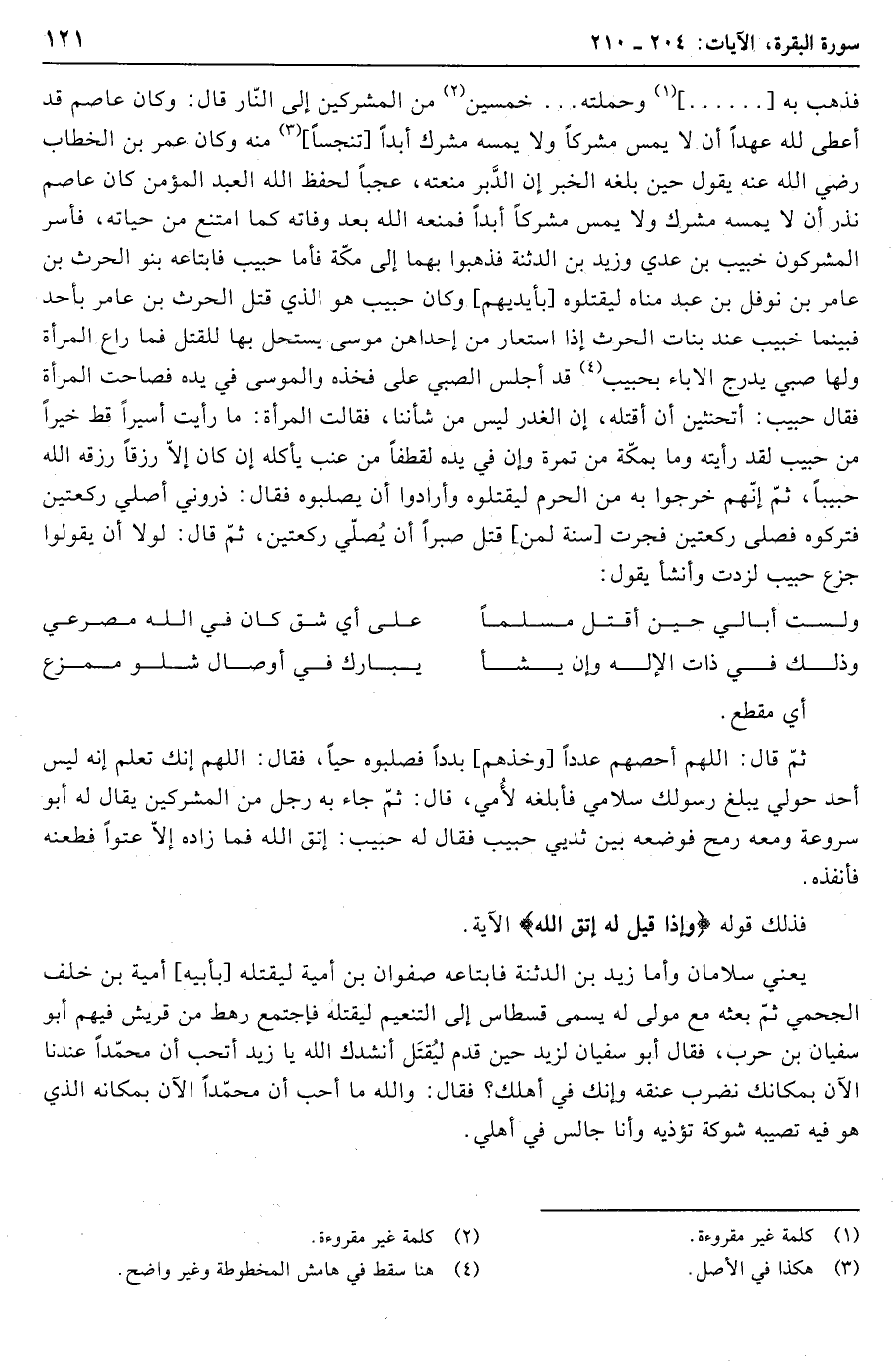 يعني سلامان وأما زيد بن الدثنة فابتاعه صفوان بن أمية ليقتله [بأبيه] أمية بن خلف الجحمي ثمّ بعثه مع مولى له يسمى قسطاس إلى التنعيم ليقتله فاجتمع رهط من قريش فيهم أبو سفيان بن حرب، فقال أبو سفيان لزيد حين قدم ليقتل أنشدك الله يا زيد أتحب أن محمّدا عندنا الآن بمكانك نضرب عنقه وإنك في أهلك؟ فقال: والله ما أحب أن محمّدا الآن بمكانه الذي هو فيه تصيبه شوكة تؤذيه وأنا جالس في أهلي.