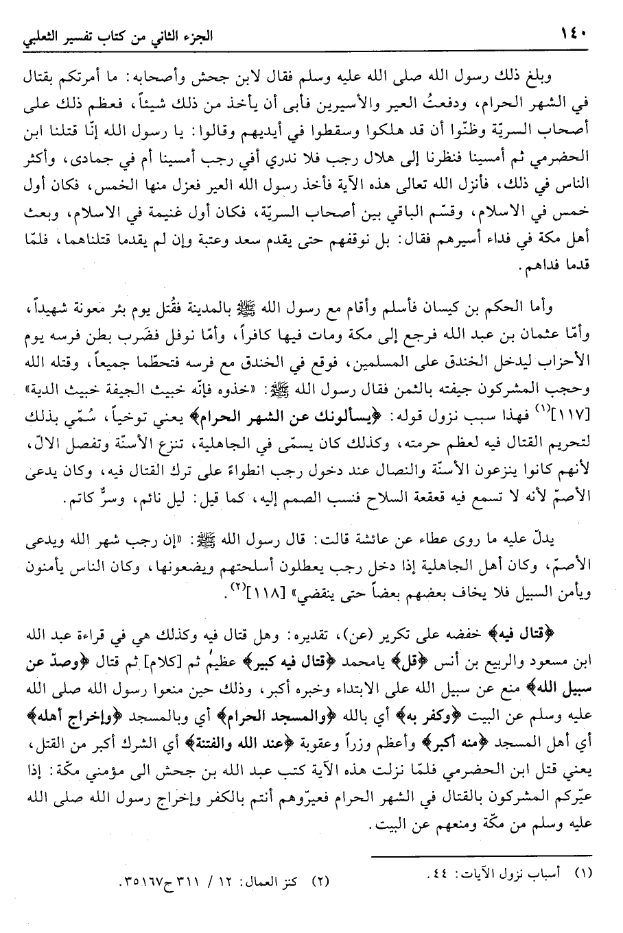 [117] «1» فهذا سبب نزول قوله: يَسْئَلُونَكَ عَنِ الشَّهْرِ الْحَرامِ يعني توخيا، سمّي بذلك لتحريم القتال فيه لعظم حرمته، وكذلك كان يسمّى في الجاهلية، تنزع الأسنّة وتفصل الالّ، لأنهم كانوا ينزعون الأسنّة والنصال عند دخول رجب انطواء على ترك القتال فيه، وكان يدعى الأصمّ لأنه لا تسمع فيه قعقعة السلاح فنسب الصمم إليه، كما قيل: ليل نائم، وسرّ كاتم.