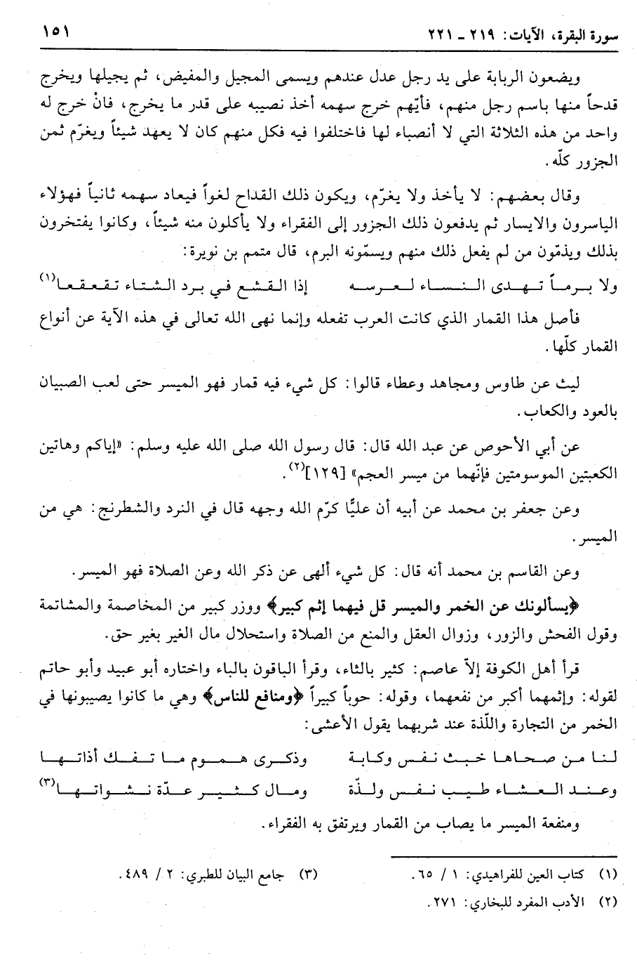 يَسْئَلُونَكَ عَنِ الْخَمْرِ وَالْمَيْسِرِ قُلْ فِيهِما إِثْمٌ كَبِيرٌ ووزر كبير من المخاصمة والمشاتمة وقول الفحش والزور، وزوال العقل والمنع من الصلاة واستحلال مال الغير بغير حق.