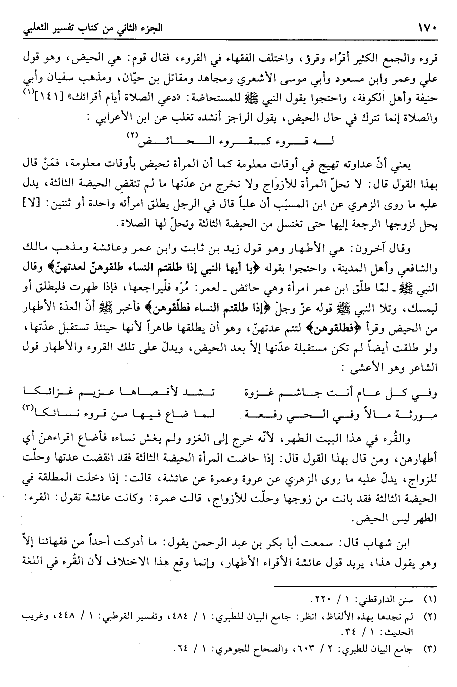 فقال قوم: هي الحيض، وهو قول علي وعمر وابن مسعود وأبي موسى الأشعري ومجاهد ومقاتل بن حيّان، ومذهب سفيان وأبي حنيفة وأهل الكوفة