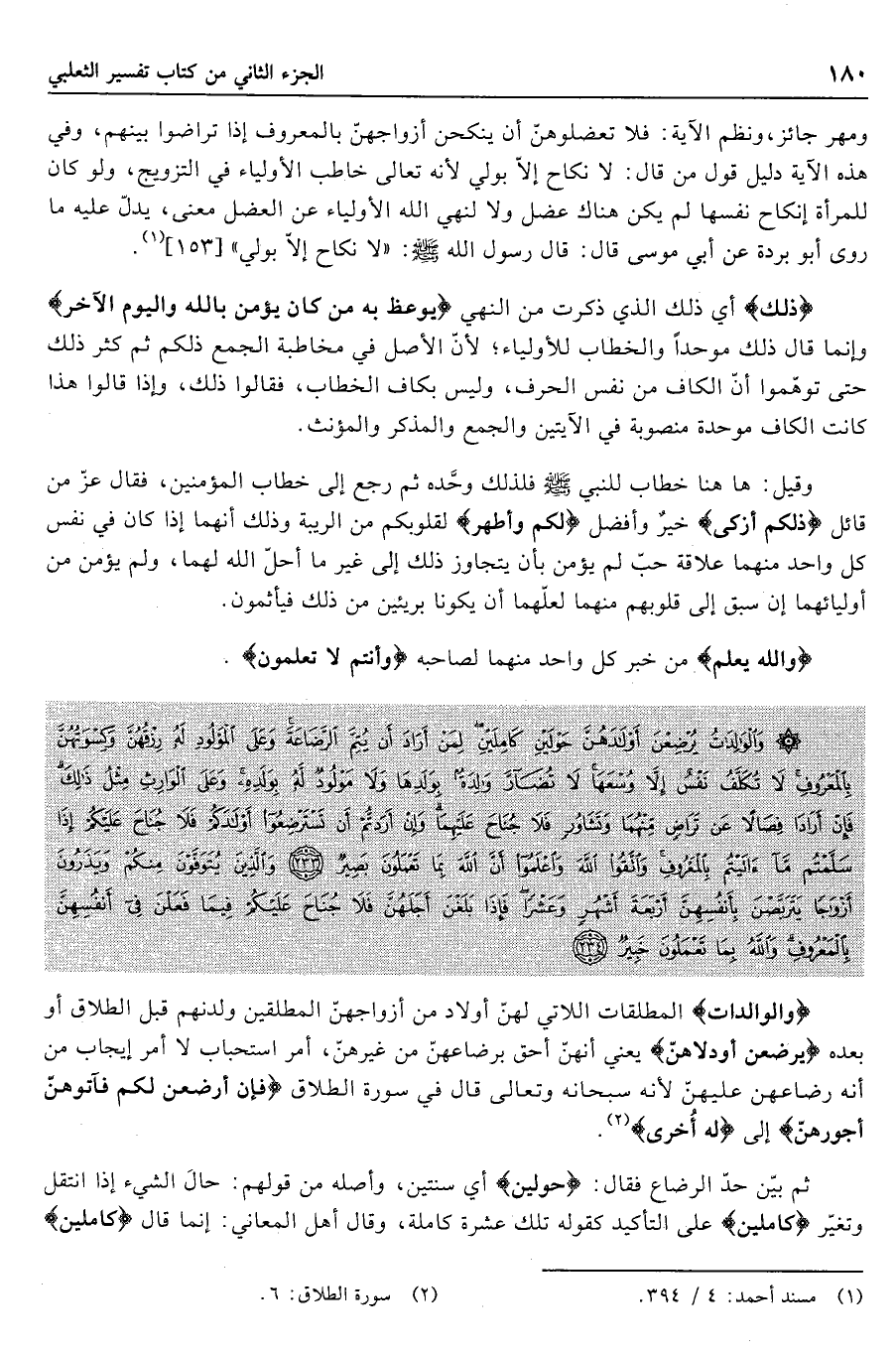 وَالْوالِداتُ يُرْضِعْنَ أَوْلادَهُنَّ حَوْلَيْنِ كامِلَيْنِ لِمَنْ أَرادَ أَنْ يُتِمَّ الرَّضاعَةَ وَعَلَى الْمَوْلُودِ لَهُ رِزْقُهُنَّ وَكِسْوَتُهُنَّ بِالْمَعْرُوفِ لا تُكَلَّفُ نَفْسٌ إِلاَّ وُسْعَها لا تُضَارَّ والِدَةٌ بِوَلَدِها وَلا مَوْلُودٌ لَهُ بِوَلَدِهِ وَعَلَى الْوارِثِ مِثْلُ ذلِكَ فَإِنْ أَرادا فِصالاً عَنْ تَراضٍ مِنْهُما وَتَشاوُرٍ فَلا جُناحَ عَلَيْهِما وَإِنْ أَرَدْتُمْ أَنْ تَسْتَرْضِعُوا أَوْلادَكُمْ فَلا جُناحَ عَلَيْكُمْ إِذا سَلَّمْتُمْ ما آتَيْتُمْ بِالْمَعْرُوفِ وَاتَّقُوا اللَّهَ وَاعْلَمُوا أَنَّ اللَّهَ بِما تَعْمَلُونَ بَصِيرٌ (233) وَالَّذِينَ يُتَوَفَّوْنَ مِنْكُمْ وَيَذَرُونَ أَزْواجاً يَتَرَبَّصْنَ بِأَنْفُسِهِنَّ أَرْبَعَةَ أَشْهُرٍ وَعَشْراً فَإِذا بَلَغْنَ أَجَلَهُنَّ فَلا جُناحَ عَلَيْكُمْ فِيما فَعَلْنَ فِي أَنْفُسِهِنَّ بِالْمَعْرُوفِ وَاللَّهُ بِما تَعْمَلُونَ خَبِيرٌ (234)