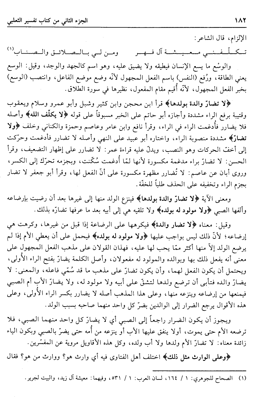 ومعنى الآية لا تُضَارَّ والِدَةٌ بِوَلَدِها فينزع الولد منها إلى غيرها بعد أن رضيت بإرضاعه وألفها الصبي وَلا مَوْلُودٌ لَهُ بِوَلَدِهِ ولا تلقيه هي إلى أبيه بعد ما عرفها تضارّه بذلك.