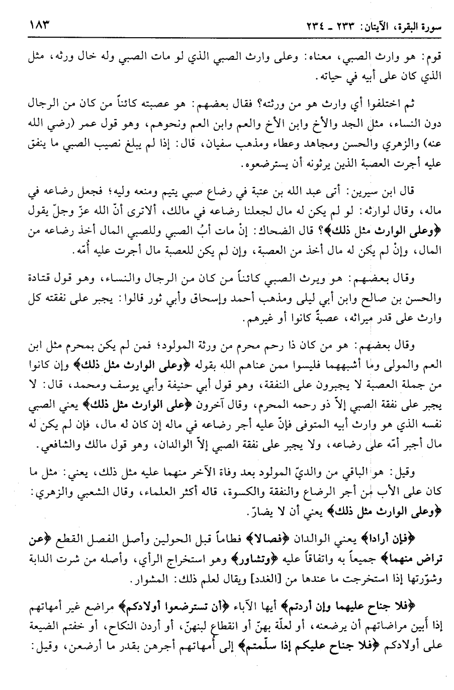 قال ابن سيرين: أتى عبد الله بن عتبة في رضاع صبي يتيم ومنعه وليه فجعل رضاعه في ماله، وقال لوارثه: لو لم يكن له مال لجعلنا رضاعه في مالك، ألا ترى أنّ الله عزّ وجلّ يقول وَعَلَى الْوارِثِ مِثْلُ ذلِكَ؟ قال الضحاك: إن مات أب الصبي وللصبي المال أخذ رضاعه من المال، وإن لم يكن له مال أخذ من العصبة، وإن لم يكن للعصبة مال أجرت عليه أمّه.
