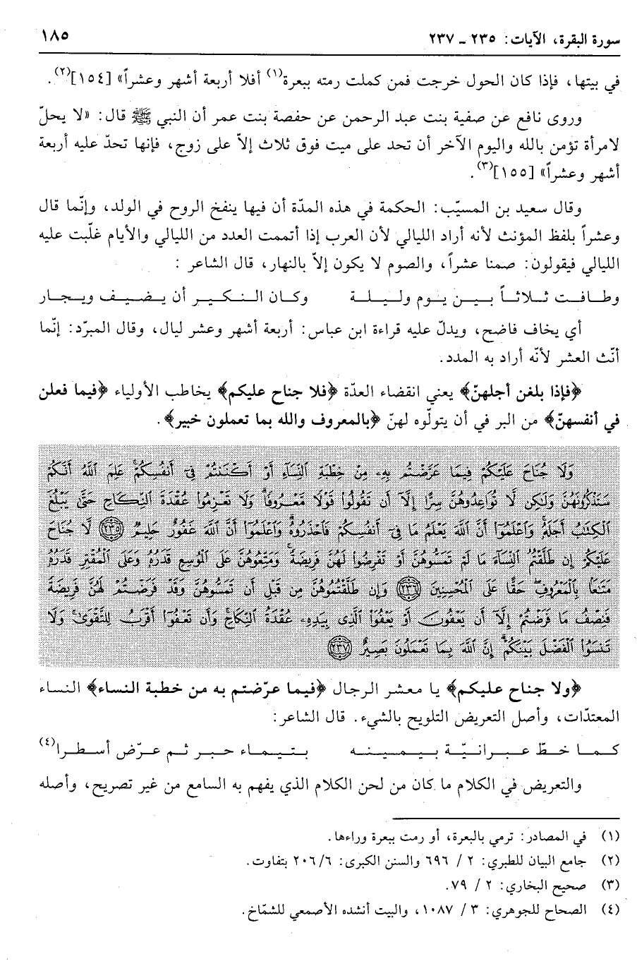 وَلا جُناحَ عَلَيْكُمْ فِيما عَرَّضْتُمْ بِهِ مِنْ خِطْبَةِ النِّساءِ أَوْ أَكْنَنْتُمْ فِي أَنْفُسِكُمْ عَلِمَ اللَّهُ أَنَّكُمْ سَتَذْكُرُونَهُنَّ وَلكِنْ لا تُواعِدُوهُنَّ سِرًّا إِلاَّ أَنْ تَقُولُوا قَوْلاً مَعْرُوفاً وَلا تَعْزِمُوا عُقْدَةَ النِّكاحِ حَتَّى يَبْلُغَ الْكِتابُ أَجَلَهُ وَاعْلَمُوا أَنَّ اللَّهَ يَعْلَمُ ما فِي أَنْفُسِكُمْ فَاحْذَرُوهُ وَاعْلَمُوا أَنَّ اللَّهَ غَفُورٌ حَلِيمٌ (235) لا جُناحَ عَلَيْكُمْ إِنْ طَلَّقْتُمُ النِّساءَ ما لَمْ تَمَسُّوهُنَّ أَوْ تَفْرِضُوا لَهُنَّ فَرِيضَةً وَمَتِّعُوهُنَّ عَلَى الْمُوسِعِ قَدَرُهُ وَعَلَى الْمُقْتِرِ قَدَرُهُ مَتاعاً بِالْمَعْرُوفِ حَقًّا عَلَى الْمُحْسِنِينَ (236) وَإِنْ طَلَّقْتُمُوهُنَّ مِنْ قَبْلِ أَنْ تَمَسُّوهُنَّ وَقَدْ فَرَضْتُمْ لَهُنَّ فَرِيضَةً فَنِصْفُ ما فَرَضْتُمْ إِلاَّ أَنْ يَعْفُونَ أَوْ يَعْفُوَا الَّذِي بِيَدِهِ عُقْدَةُ النِّكاحِ وَأَنْ تَعْفُوا أَقْرَبُ لِلتَّقْوى وَلا تَنْسَوُا الْفَضْلَ بَيْنَكُمْ إِنَّ اللَّهَ بِما تَعْمَلُونَ بَصِيرٌ (237)