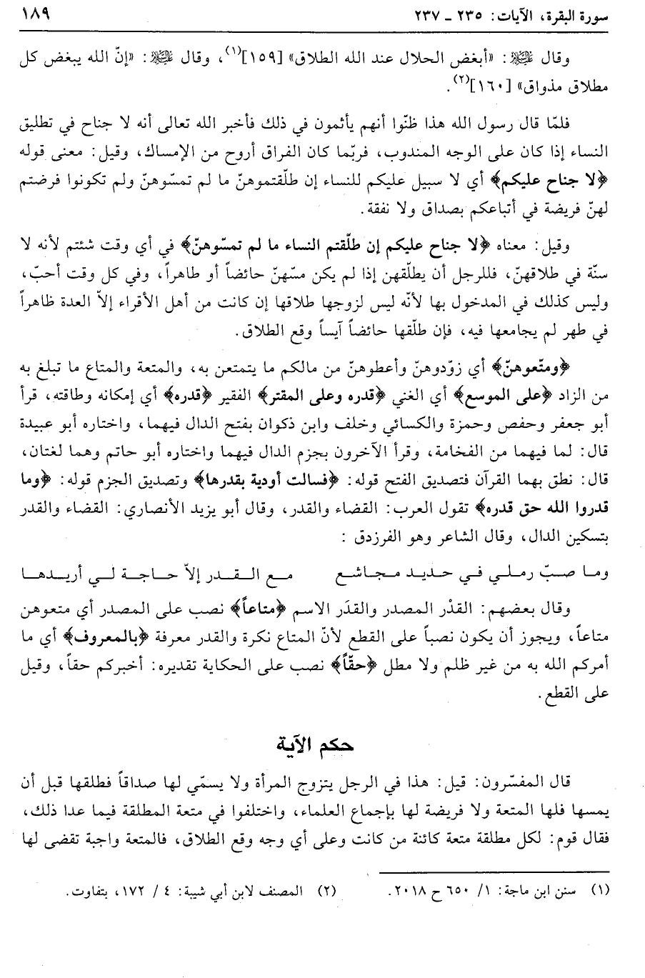 قال المفسّرون: قيل: هذا في الرجل يتزوج المرأة ولا يسمّي لها صداقا فطلقها قبل أن يمسها فلها المتعة ولا فريضة لها بإجماع العلماء، واختلفوا في متعة المطلقة فيما عدا ذلك، فقال قوم: لكل مطلقة متعة كائنة من كانت وعلى أي وجه وقع الطلاق، فالمتعة واجبة تقضى لها