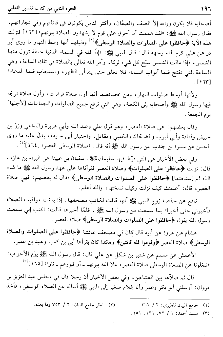 سفيان بن عيينة عن البراء بن عازب قال: نزلت حافِظُوا عَلَى الصَّلَواتِ وصلاة العصر فقرأناها على عهد رسول الله صلّى الله عليه وسلّم ما شاء الله ثم [نسختها] حافِظُوا عَلَى الصَّلَواتِ وَالصَّلاةِ الْوُسْطى فقال له بعضهم: فهي صلاة العصر، قال: أعلمتك كيف نزلت وكيف نسختها، والله أعلم.
