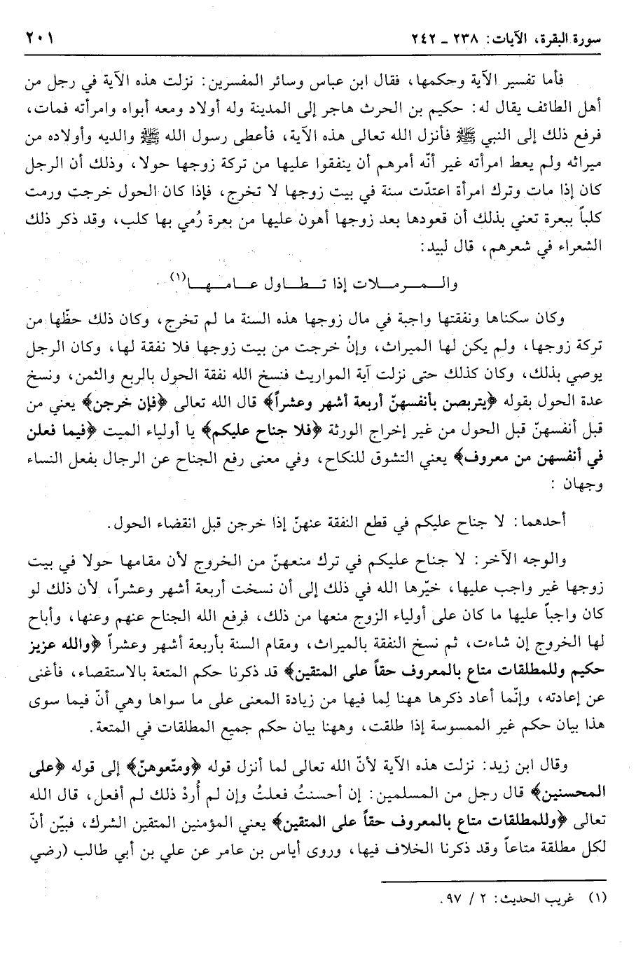 وكان سكناها ونفقتها واجبة في مال زوجها هذه السنة ما لم تخرج، وكان ذلك حظّها من تركة زوجها، ولم يكن لها الميراث، وإن خرجت من بيت زوجها فلا نفقة لها، وكان الرجل يوصي بذلك، وكان كذلك حتّى نزلت آية المواريث فنسخ الله نفقة الحول بالربع والثمن، ونسخ عدة الحول بقوله يَتَرَبَّصْنَ بِأَنْفُسِهِنَّ أَرْبَعَةَ أَشْهُرٍ وَعَشْراً قال الله تعالى فَإِنْ خَرَجْنَ يعني من قبل أنفسهنّ قبل الحول من غير إخراج الورثة فَلا جُناحَ عَلَيْكُمْ يا أولياء الميت فِي ما فَعَلْنَ فِي أَنْفُسِهِنَّ مِنْ مَعْرُوفٍ يعني التشوق للنكاح، وفي معنى رفع الجناح عن الرجال بفعل النساء وجهان: