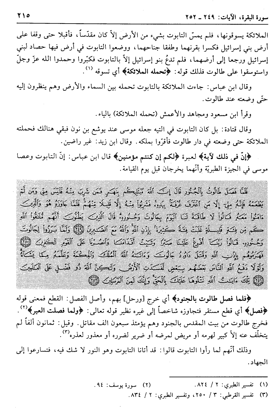فَلَمَّا فَصَلَ طالُوتُ بِالْجُنُودِ قالَ إِنَّ اللَّهَ مُبْتَلِيكُمْ بِنَهَرٍ فَمَنْ شَرِبَ مِنْهُ فَلَيْسَ مِنِّي وَمَنْ لَمْ يَطْعَمْهُ فَإِنَّهُ مِنِّي إِلاَّ مَنِ اغْتَرَفَ غُرْفَةً بِيَدِهِ فَشَرِبُوا مِنْهُ إِلاَّ قَلِيلاً مِنْهُمْ فَلَمَّا جاوَزَهُ هُوَ وَالَّذِينَ آمَنُوا مَعَهُ قالُوا لا طاقَةَ لَنَا الْيَوْمَ بِجالُوتَ وَجُنُودِهِ قالَ الَّذِينَ يَظُنُّونَ أَنَّهُمْ مُلاقُوا اللَّهِ كَمْ مِنْ فِئَةٍ قَلِيلَةٍ غَلَبَتْ فِئَةً كَثِيرَةً بِإِذْنِ اللَّهِ وَاللَّهُ مَعَ الصَّابِرِينَ (249) وَلَمَّا بَرَزُوا لِجالُوتَ وَجُنُودِهِ قالُوا رَبَّنا أَفْرِغْ عَلَيْنا صَبْراً وَثَبِّتْ أَقْدامَنا وَانْصُرْنا عَلَى الْقَوْمِ الْكافِرِينَ (250) فَهَزَمُوهُمْ بِإِذْنِ اللَّهِ وَقَتَلَ داوُدُ جالُوتَ وَآتاهُ اللَّهُ الْمُلْكَ وَالْحِكْمَةَ وَعَلَّمَهُ مِمَّا يَشاءُ وَلَوْلا دَفْعُ اللَّهِ النَّاسَ بَعْضَهُمْ بِبَعْضٍ لَفَسَدَتِ الْأَرْضُ وَلكِنَّ اللَّهَ ذُو فَضْلٍ عَلَى الْعالَمِينَ (251) تِلْكَ آياتُ اللَّهِ نَتْلُوها عَلَيْكَ بِالْحَقِّ وَإِنَّكَ لَمِنَ الْمُرْسَلِينَ (252)