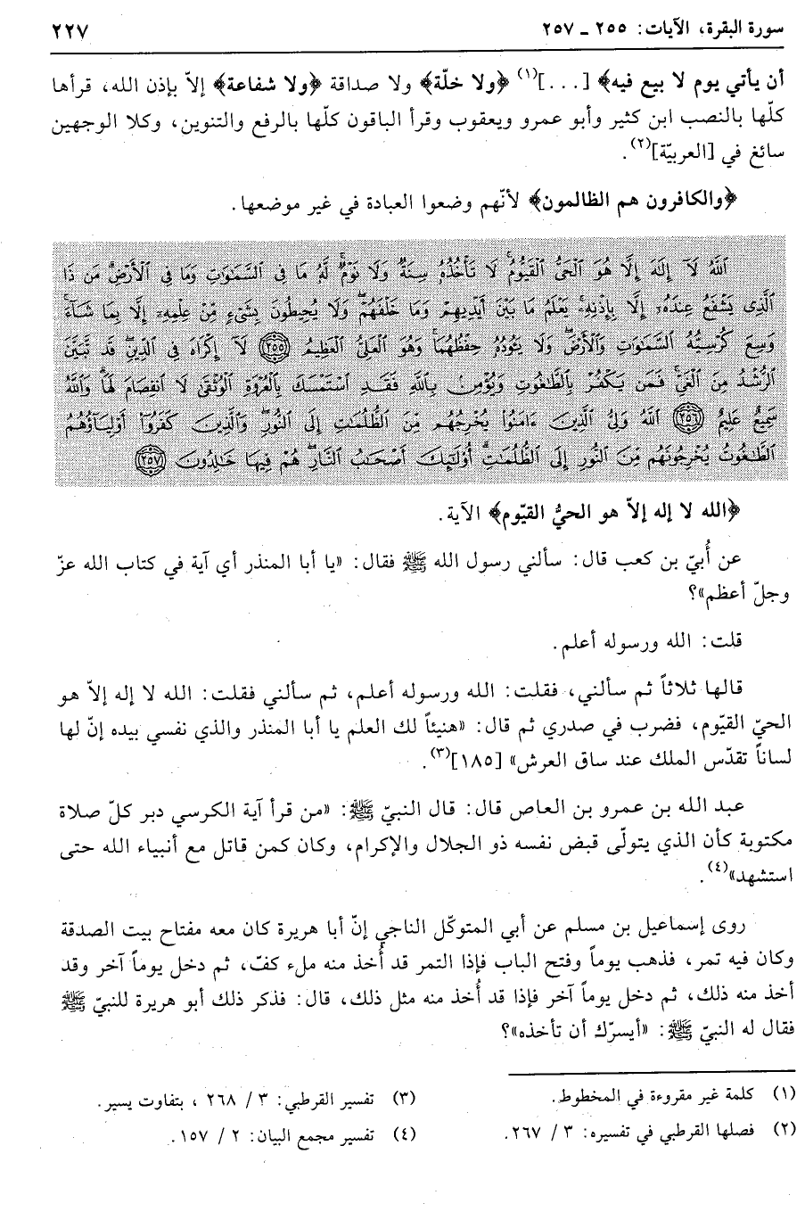 اللَّهُ لا إِلهَ إِلاَّ هُوَ الْحَيُّ الْقَيُّومُ لا تَأْخُذُهُ سِنَةٌ وَلا نَوْمٌ لَهُ ما فِي السَّماواتِ وَما فِي الْأَرْضِ مَنْ ذَا الَّذِي يَشْفَعُ عِنْدَهُ إِلاَّ بِإِذْنِهِ يَعْلَمُ ما بَيْنَ أَيْدِيهِمْ وَما خَلْفَهُمْ وَلا يُحِيطُونَ بِشَيْءٍ مِنْ عِلْمِهِ إِلاَّ بِما شاءَ وَسِعَ كُرْسِيُّهُ السَّماواتِ وَالْأَرْضَ وَلا يَؤُدُهُ حِفْظُهُما وَهُوَ الْعَلِيُّ الْعَظِيمُ (255) لا إِكْراهَ فِي الدِّينِ قَدْ تَبَيَّنَ الرُّشْدُ مِنَ الْغَيِّ فَمَنْ يَكْفُرْ بِالطَّاغُوتِ وَيُؤْمِنْ بِاللَّهِ فَقَدِ اسْتَمْسَكَ بِالْعُرْوَةِ الْوُثْقى لا انْفِصامَ لَها وَاللَّهُ سَمِيعٌ عَلِيمٌ (256) اللَّهُ وَلِيُّ الَّذِينَ آمَنُوا يُخْرِجُهُمْ مِنَ الظُّلُماتِ إِلَى النُّورِ وَالَّذِينَ كَفَرُوا أَوْلِياؤُهُمُ الطَّاغُوتُ يُخْرِجُونَهُمْ مِنَ النُّورِ إِلَى الظُّلُماتِ أُولئِكَ أَصْحابُ النَّارِ هُمْ فِيها خالِدُونَ (257)
