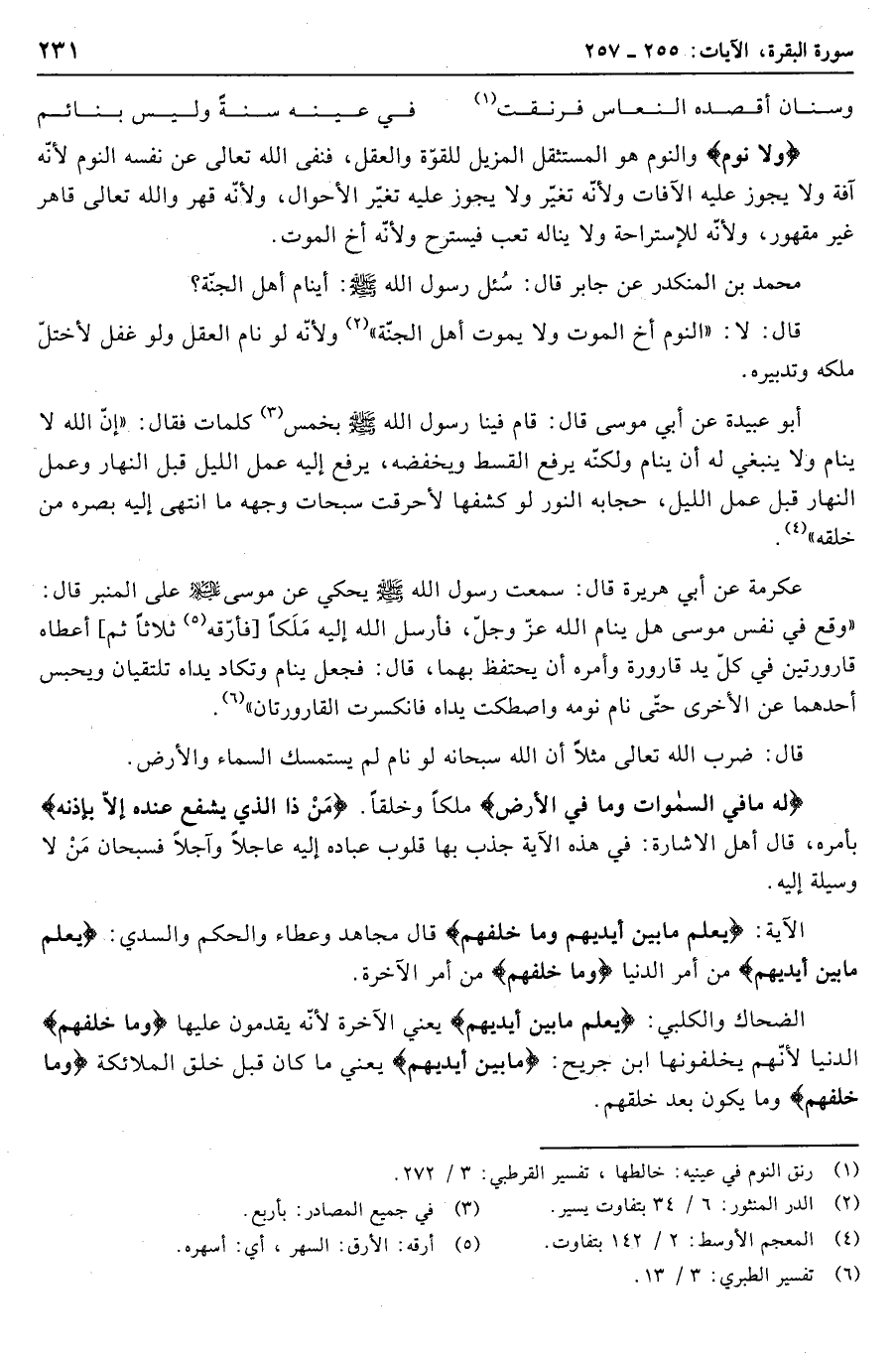 وَلا نَوْمٌ والنوم هو المستثقل المزيل للقوّة والعقل، فنفى الله تعالى عن نفسه النوم لأنّه آفة ولا يجوز عليه الآفات ولأنّه تغيّر ولا يجوز عليه تغيّر الأحوال، ولأنّه قهر والله تعالى قاهر غير مقهور، ولأنّه للاستراحة ولا يناله تعب فيسترح ولأنّه أخ الموت.