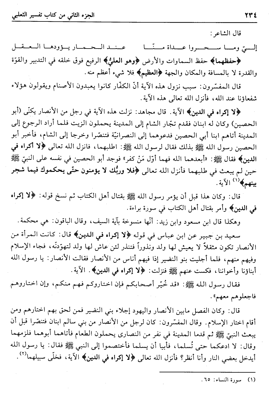 سعيد بن جبير عن ابن عباس في قوله لا إِكْراهَ فِي الدِّينِ قال: كانت المرأة من الأنصار تكون مثقلا لا يعيش لها ولد ونذورا فتنذر لئن عاش لها ولد لتهوّدنّه، فجاء الإسلام وفيهم منهم، فلما أجليت بنو النضير إذا فيهم أناس من الأنصار فقالت الأنصار: يا رسول الله أبناؤنا وإخواننا، فسكت عنهم صلّى الله عليه وسلّم فنزلت: لا إِكْراهَ فِي الدِّينِ. الآية.