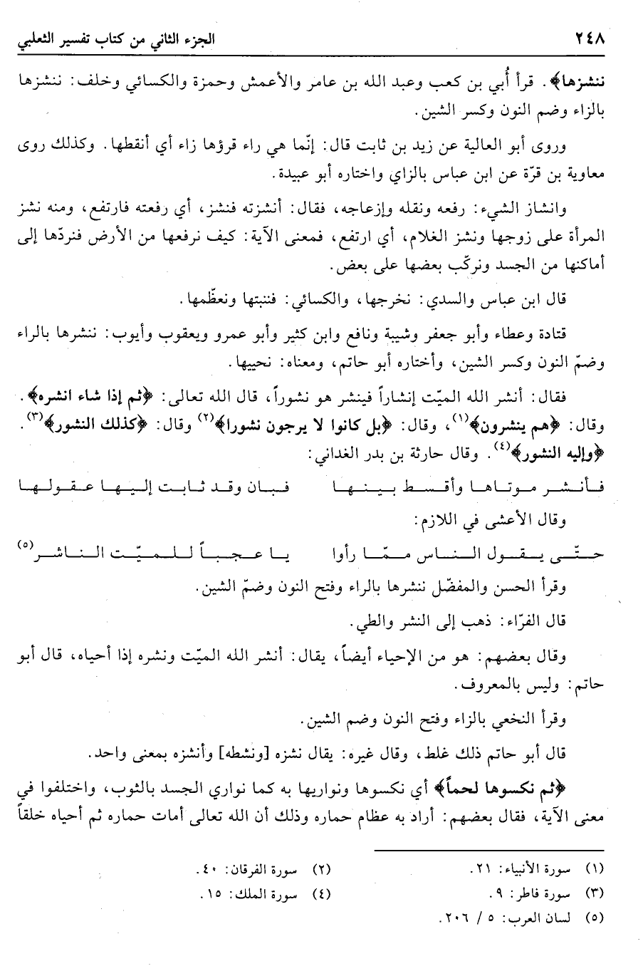 ثُمَّ نَكْسُوها لَحْماً أي نكسوها ونواريها به كما نواري الجسد بالثوب، واختلفوا في معنى الآية، فقال بعضهم: أراد به عظام حماره وذلك أن الله تعالى أمات حماره ثم أحياه خلقا