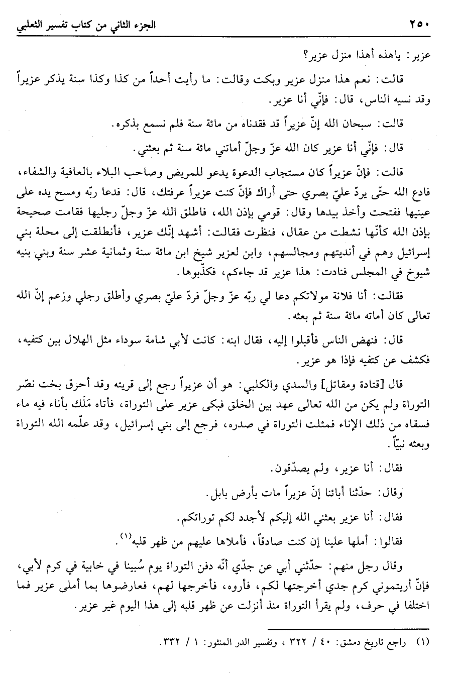 وقال رجل منهم: حدّثني أبي عن جدّي أنّه دفن التوراة يوم سبينا في خابية في كرم لأبي، فإنّ أريتموني كرم جدي أخرجتها لكم، فأروه، فأخرجها لهم، فعارضوها بما أملى عزير فما اختلفا في حرف، ولم يقرأ التوراة منذ أنزلت عن ظهر قلبه إلى هذا اليوم غير عزير.