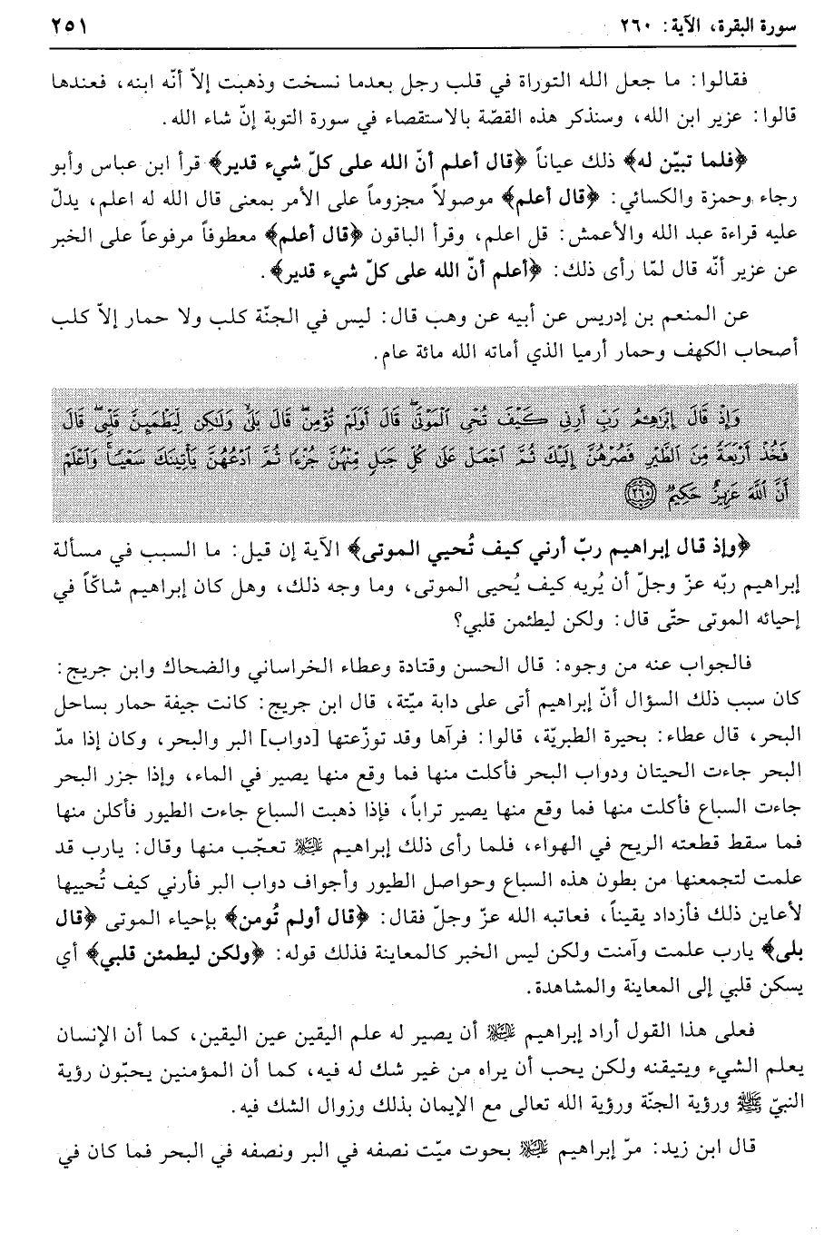 وَإِذْ قالَ إِبْراهِيمُ رَبِّ أَرِنِي كَيْفَ تُحْيِ الْمَوْتى قالَ أَوَلَمْ تُؤْمِنْ قالَ بَلى وَلكِنْ لِيَطْمَئِنَّ قَلْبِي قالَ فَخُذْ أَرْبَعَةً مِنَ الطَّيْرِ فَصُرْهُنَّ إِلَيْكَ ثُمَّ اجْعَلْ عَلى كُلِّ جَبَلٍ مِنْهُنَّ جُزْءاً ثُمَّ ادْعُهُنَّ يَأْتِينَكَ سَعْياً وَاعْلَمْ أَنَّ اللَّهَ عَزِيزٌ حَكِيمٌ (260)