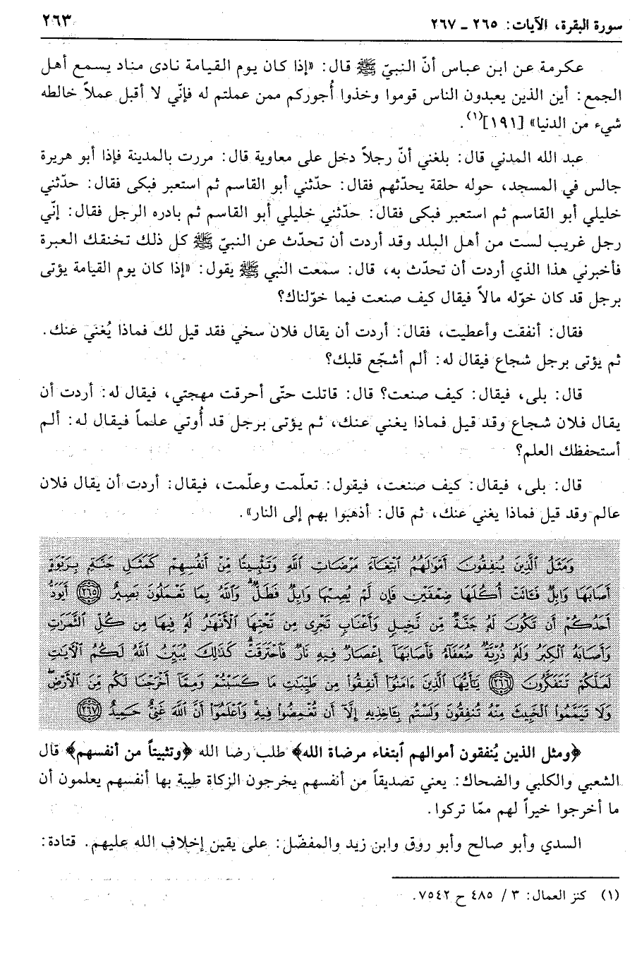 وَمَثَلُ الَّذِينَ يُنْفِقُونَ أَمْوالَهُمُ ابْتِغاءَ مَرْضاتِ اللَّهِ وَتَثْبِيتاً مِنْ أَنْفُسِهِمْ كَمَثَلِ جَنَّةٍ بِرَبْوَةٍ أَصابَها وابِلٌ فَآتَتْ أُكُلَها ضِعْفَيْنِ فَإِنْ لَمْ يُصِبْها وابِلٌ فَطَلٌّ وَاللَّهُ بِما تَعْمَلُونَ بَصِيرٌ (265) أَيَوَدُّ أَحَدُكُمْ أَنْ تَكُونَ لَهُ جَنَّةٌ مِنْ نَخِيلٍ وَأَعْنابٍ تَجْرِي مِنْ تَحْتِهَا الْأَنْهارُ لَهُ فِيها مِنْ كُلِّ الثَّمَراتِ وَأَصابَهُ الْكِبَرُ وَلَهُ ذُرِّيَّةٌ ضُعَفاءُ فَأَصابَها إِعْصارٌ فِيهِ نارٌ فَاحْتَرَقَتْ كَذلِكَ يُبَيِّنُ اللَّهُ لَكُمُ الْآياتِ لَعَلَّكُمْ تَتَفَكَّرُونَ (266) يا أَيُّهَا الَّذِينَ آمَنُوا أَنْفِقُوا مِنْ طَيِّباتِ ما كَسَبْتُمْ وَمِمَّا أَخْرَجْنا لَكُمْ مِنَ الْأَرْضِ وَلا تَيَمَّمُوا الْخَبِيثَ مِنْهُ تُنْفِقُونَ وَلَسْتُمْ بِآخِذِيهِ إِلاَّ أَنْ تُغْمِضُوا فِيهِ وَاعْلَمُوا أَنَّ اللَّهَ غَنِيٌّ حَمِيدٌ (267)