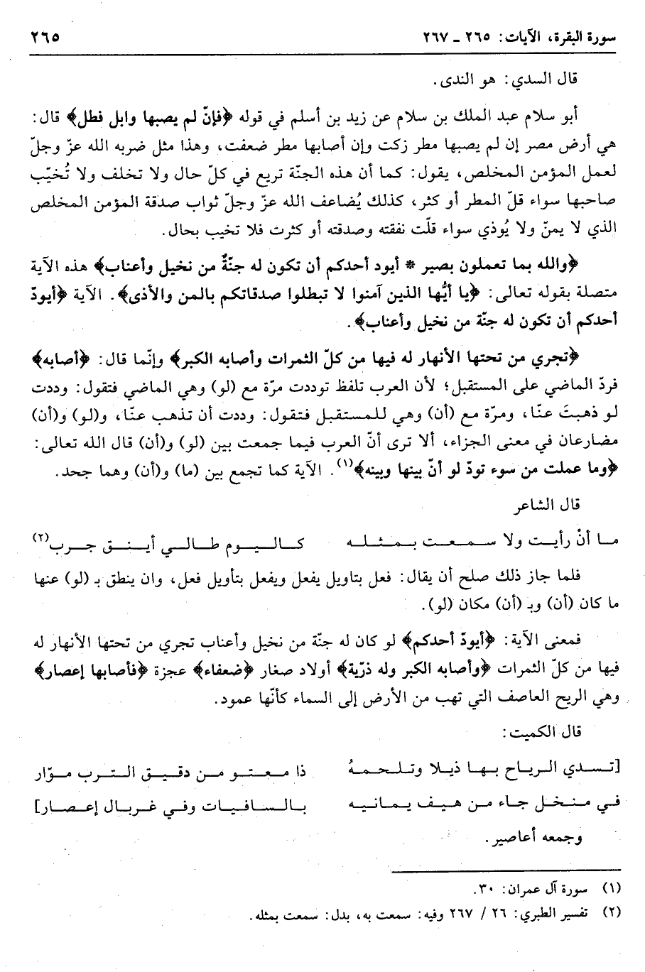 تَجْرِي مِنْ تَحْتِهَا الْأَنْهارُ لَهُ فِيها مِنْ كُلِّ الثَّمَراتِ وَأَصابَهُ الْكِبَرُ وإنّما قال: أَصابَهُ فردّ الماضي على المستقبل لأن العرب تلفظ توددت مرّة مع (لو) وهي الماضي فتقول: وددت لو ذهبت عنّا، ومرّة مع (أن) وهي للمستقبل فتقول: وددت أن تذهب عنّا، و (لو) و (أن) مضارعان في معنى الجزاء، ألا ترى أنّ العرب فيما جمعت بين (لو) و (أن) قال الله تعالى: