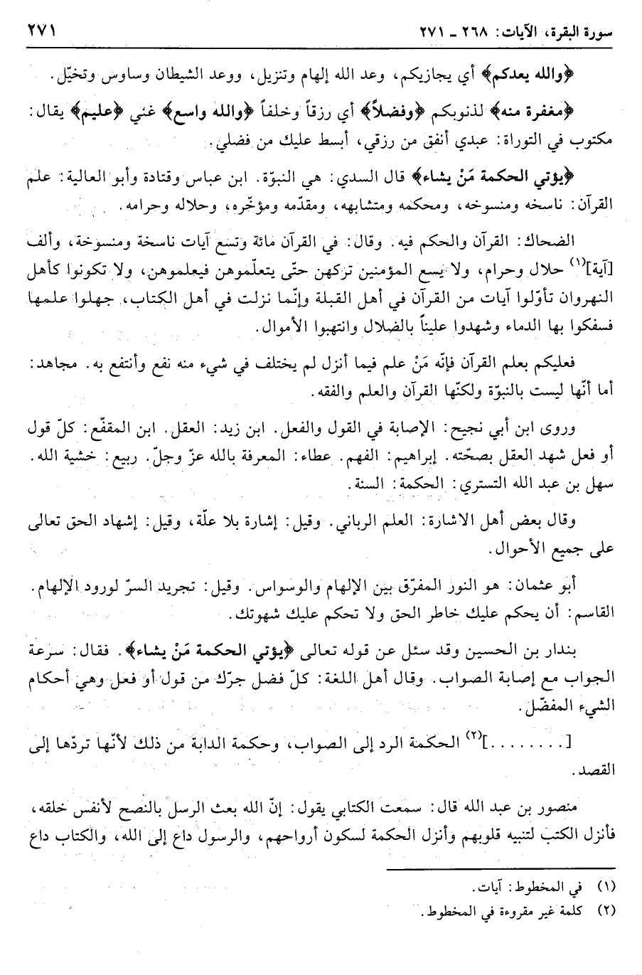 يُؤْتِي الْحِكْمَةَ مَنْ يَشاءُ قال السدي: هي النبوّة. ابن عباس وقتادة وأبو العالية: علم القرآن: ناسخه ومنسوخه، ومحكمه ومتشابهه، ومقدّمه ومؤخّره، وحلاله وحرامه.
