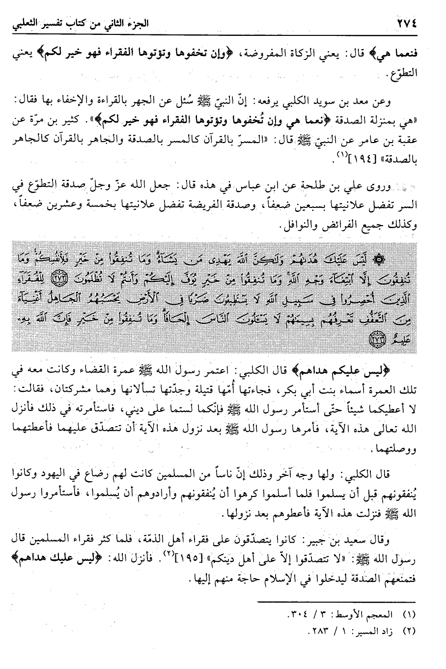 لَيْسَ عَلَيْكَ هُداهُمْ وَلكِنَّ اللَّهَ يَهْدِي مَنْ يَشاءُ وَما تُنْفِقُوا مِنْ خَيْرٍ فَلِأَنْفُسِكُمْ وَما تُنْفِقُونَ إِلاَّ ابْتِغاءَ وَجْهِ اللَّهِ وَما تُنْفِقُوا مِنْ خَيْرٍ يُوَفَّ إِلَيْكُمْ وَأَنْتُمْ لا تُظْلَمُونَ (272) لِلْفُقَراءِ الَّذِينَ أُحْصِرُوا فِي سَبِيلِ اللَّهِ لا يَسْتَطِيعُونَ ضَرْباً فِي الْأَرْضِ يَحْسَبُهُمُ الْجاهِلُ أَغْنِياءَ مِنَ التَّعَفُّفِ تَعْرِفُهُمْ بِسِيماهُمْ لا يَسْئَلُونَ النَّاسَ إِلْحافاً وَما تُنْفِقُوا مِنْ خَيْرٍ فَإِنَّ اللَّهَ بِهِ عَلِيمٌ (273)