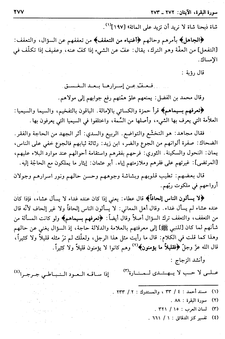 لا يَسْئَلُونَ النَّاسَ إِلْحافاً قال عطاء: يعني إذا كان عنده غداء لا يسأل عشاء، فإذا كان عنده عشاء لم يسأل غداء. وقال أهل المعاني: لا يَسْئَلُونَ النَّاسَ إِلْحافاً ولا غير إلحاف لأنّه قال مِنَ التَّعَفُّفِ، والتعفف ترك السؤال أصلا وقال أيضا: تَعْرِفُهُمْ بِسِيماهُمْ ولو كانت المسألة من شأنهم لما كان [للنبي صلّى الله عليه وسلّم] إلى معرفتهم بالعلامة والدلالة حاجة، إذ السؤال يغني عن حالهم وهذا كما قلت في الكلام: قال ما رأيت مثل هذا الرجل، ولعلّك لم تر مثله قليلا ولا كثيرا، قال الله عزّ وجلّ فَقَلِيلًا ما يُؤْمِنُونَ «2» وهم كانوا لا يؤمنون قليلا ولا كثيرا.