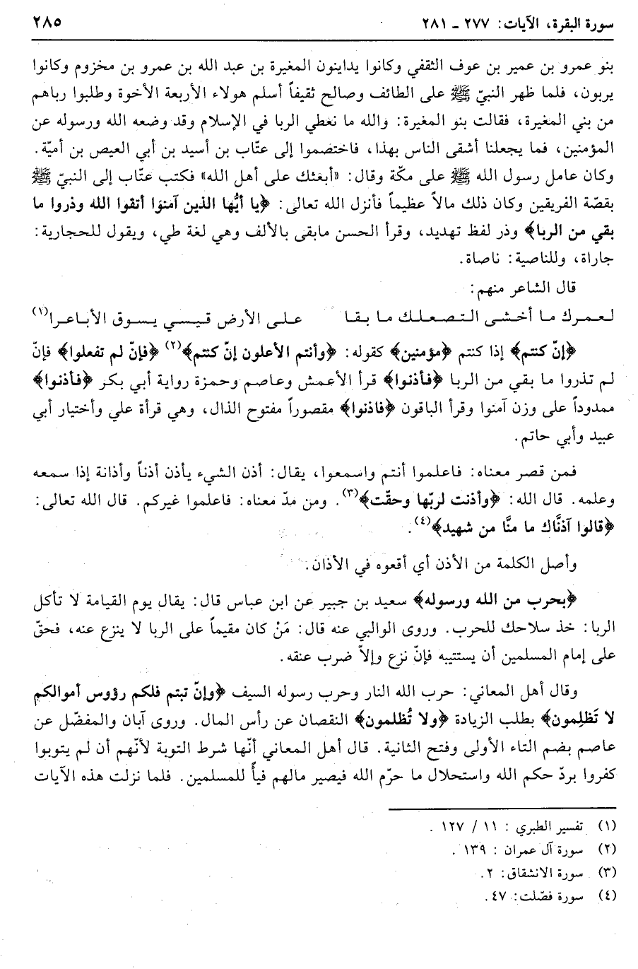 بِحَرْبٍ مِنَ اللَّهِ وَرَسُولِهِ سعيد بن جبير عن ابن عباس قال: يقال يوم القيامة لا تأكل الربا: خذ سلاحك للحرب. وروى الوالبي عنه قال: من كان مقيما على الربا لا ينزع عنه، فحقّ على إمام المسلمين أن يستتيبه فإنّ نزع وإلّا ضرب عنقه.