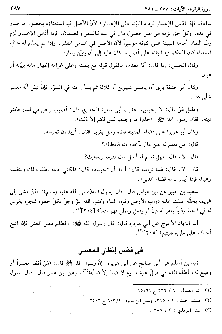 سعيد بن جبير عن ابن عباس قال: قال رسول الله (صلى الله عليه وسلّم) : «من مشى إلى غريمه بحقّه صلت عليه دواب الأرض ونون الماء وكتب الله عزّ وجلّ بكلّ خطوة شجرة يغرس له في الجنّة وذنبا يغفر له فإنّ لم يفعل ومطل فهو متعدّ» [204] «1» .
