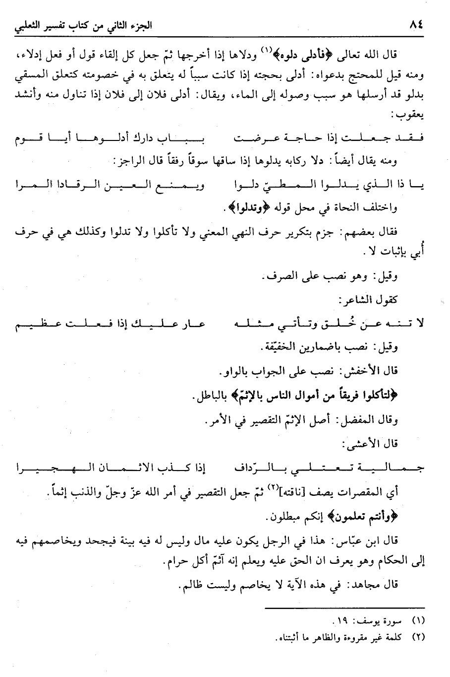 قال ابن عبّاس: هذا في الرجل يكون عليه مال وليس له فيه بينة فيجحد ويخاصمهم فيه إلى الحكام وهو يعرف ان الحق عليه ويعلم إنه آثم أكل حرام.