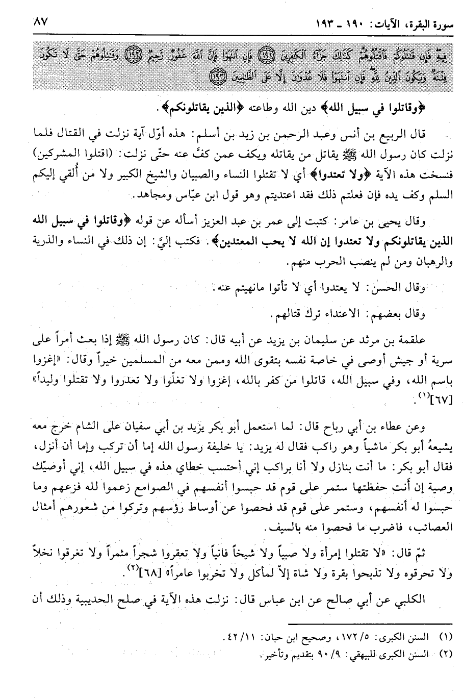 قال الربيع بن أنس وعبد الرحمن بن زيد بن أسلم: هذه أوّل آية نزلت في القتال فلما نزلت كان رسول الله صلّى الله عليه وسلّم يقاتل من يقاتله ويكف عمن كفّ عنه حتّى نزلت: فَاقْتُلُوا الْمُشْرِكِينَ فنسخت هذه الآية وَلا تَعْتَدُوا أي لا تقتلوا النساء والصبيان والشيخ الكبير ولا من ألقي إليكم السلم وكف يده فإن فعلتم ذلك فقد اعتديتم
