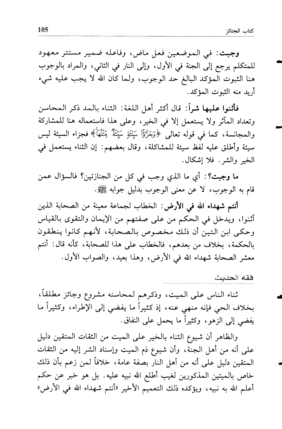 والظاهر أن شيوع الثناء بالخير على الميت من الثقات المتقين دليل على أنه من أهل الجنة وأن شيوع ذم الميت وإسناد الشر إليه من الثقات المتقين دليل على أنه من أهل النار بصفة عامة خلافا لمن زعم بأن ذلك خاص بالميتين المذكورين لغيب أطلع الله نبيه عليه بل هو خبر عن حكم أعلم الله به نبيه ويؤكده ذلك التعميم الأخير "أنتم شهداء الله في الأرض"