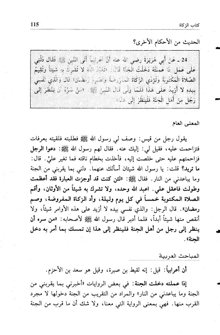 24 - عن أبي هريرة رضي الله عنه أن أعرابيا أتى النبي صلى الله عليه وسلم فقال دلني على عمل إذا عملته دخلت الجنة قال: "تعبد الله لا تشرك به شيئا وتقيم الصلاة المكتوبة وتؤدي الزكاة المفروضة وتصوم رمضان" قال والذي نفسي بيده لا أزيد على هذا فلما ولى قال النبي صلى الله عليه وسلم: "من سره أن ينظر إلى رجل من أهل الجنة فلينظر إلى هذا"