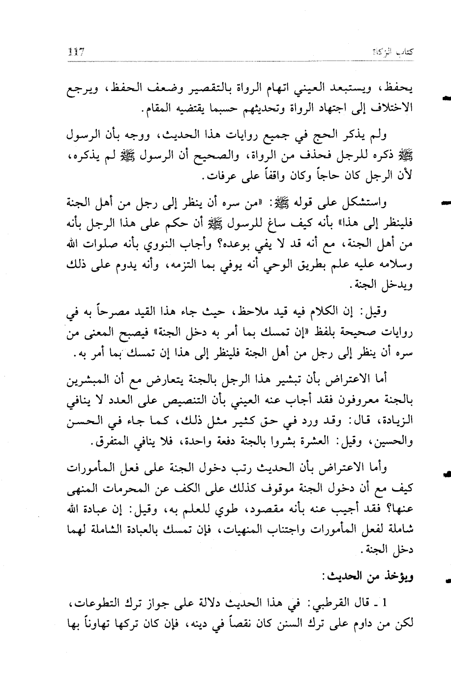 وقيل: إن الكلام فيه قيد ملاحظ حيث جاء هذا القيد مصرحا به في روايات صحيحة بلفظ "إن تمسك بما أمر به دخل الجنة" فيصبح المعنى من سره أن ينظر إلى رجل من أهل الجنة فلينظر إلى هذا إن تمسك بما أمر به