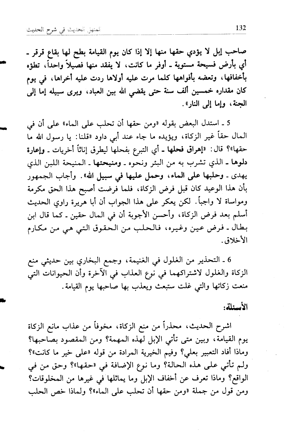 5 - استدل البعض بقوله "ومن حقها أن تحلب على الماء" على أن في المال حقا غير الزكاة ويؤيده ما جاء عند أبي داود "قلنا: يا رسول الله. ما حقها؟ قال: إهراق فحلها -أي التبرع بفحلها ليطرق إناثا أخريات -وإعارة دلوها -الذي تشرب به من البئر ونحوه -ومنيحتها -المنيحة اللبن الذي يهدى -وحلبها على الماء وحمل عليها في سبيل الله وأجاب الجمهور بأن هذا الوعيد كان قبل فرض الزكاة، فلما فرضت أصبح هذا الحق مكرمة ومواساة لا واجبا لكن يعكر على هذا الجواب أن أبا هريرة راوي الحديث أسلم بعد فرض الزكاة وأحسن الأجوبة أن في المال حقين -كما قال ابن بطال -فرض عين وغيره فالحلب من الحقوق التي هي من مكارم الأخلاق