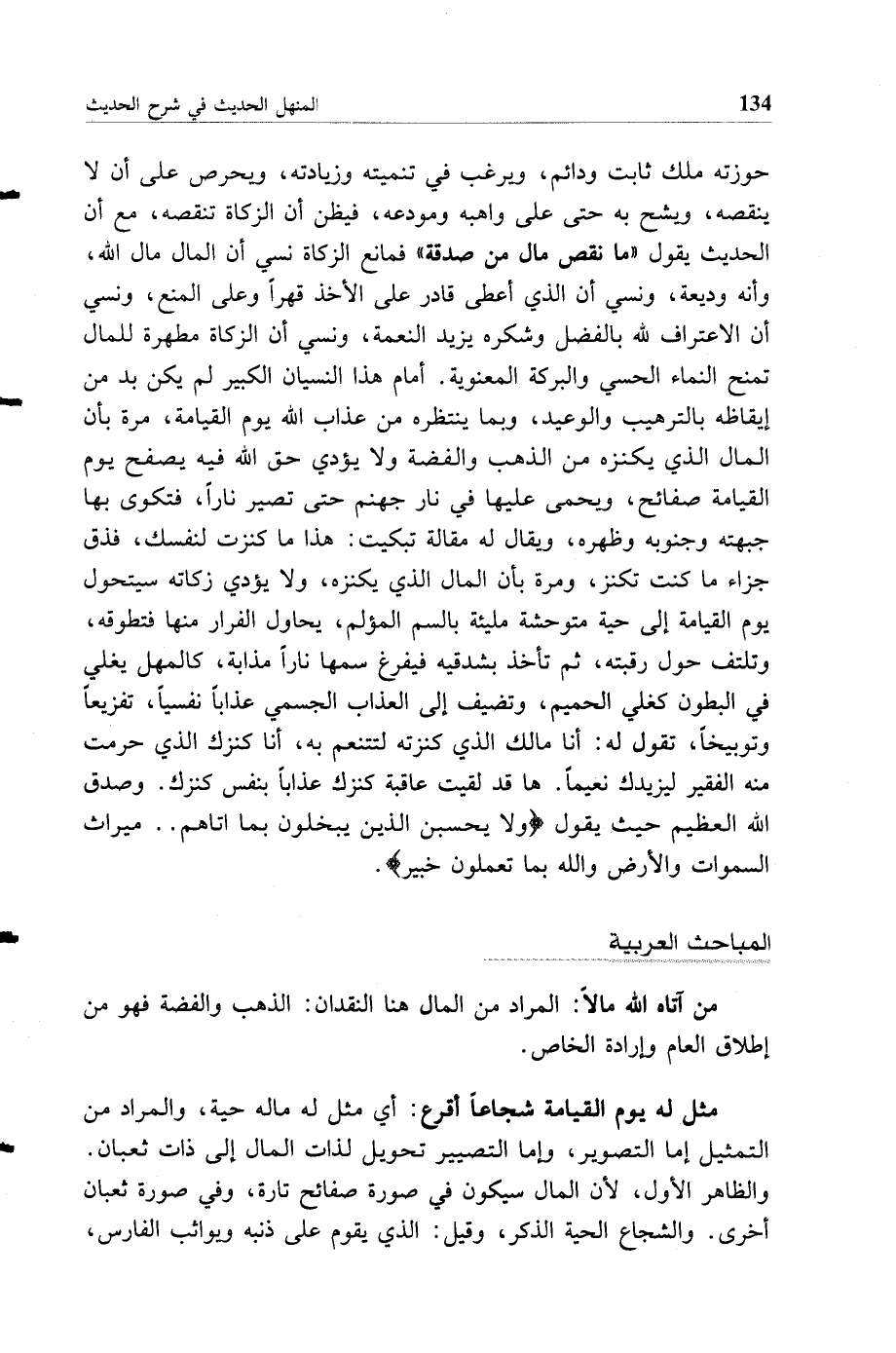 حوزته ملك ثابت ودائم ويرغب في تنميته وزيادته ويحرص على أن لا ينقصه ويشح به حتى على واهبه ومودعه فيظن أن الزكاة تنقصه مع أن الحديث يقول "ما نقص مال من صدقة" فمانع الزكاة نسي أن المال مال الله وأنه وديعة ونسي أن الذي أعطى قادر على الأخذ قهرا وعلى المنع ونسي أن الاعتراف لله بالفضل وشكره يزيد النعمة ونسي أن الزكاة مطهرة للمال تمنح النماء الحسي والبركة المعنوية أمام هذا النسيان الكبير لم يكن بد من إيقاظه بالترهيب والوعيد وبما ينتظره من عذاب الله يوم القيامة مرة بأن المال الذي يكنزه من الذهب والفضة ولا يؤدي حق الله فيه يصفح يوم القيامة صفائح ويحمى عليها في نار جهنم حتى تصير نارا فتكوى بها جبهته وجنوبه وظهره ويقال له مقالة تبكيت: هذا ما كنزت لنفسك، فذق جزاء ما كنت تكنز، ومرة بأن المال الذي يكنزه، ولا يؤدي زكاته سيتحول يوم القيامة إلى حية متوحشة مليئة بالسم المؤلم، يحاول الفرار منها فتطوقه، وتلتف حول رقبته، ثم تأخذ بشدقيه فيفرغ سمها نارا مذابة، كالمهل يغلي في البطون كغلي الحميم، وتضيف إلى العذاب الجسمي عذابا نفسيا، تفزيعا وتوبيخا، تقول له: أنا مالك الذي كنزته لتتنعم به، أنا كنزك الذي حرمت منه الفقير ليزيدك نعيما. ها قد لقيت عاقبة كنزك عذابا بنفس كنزك. وصدق الله العظيم حيث يقول {ولا يحسبن الذين يبخلون بما آتاهم الله من فضله هو خيرا لهم بل هو شر لهم سيطوقون ما بخلوا به يوم القيامة ولله ميراث السموات والأرض والله بما تعملون خبير.}