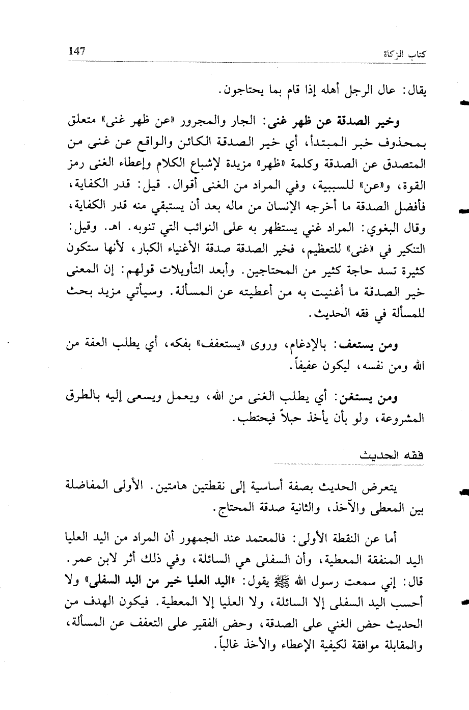 (وخير الصدقة عن ظهر غنى) الجار والمجرور "عن ظهر غنى" متعلق بمحذوف خبر المبتدأ، أي خير الصدقة الكائن والواقع عن غنى من المتصدق عن الصدقة وكلمة "ظهر" مزيدة لإشباع الكلام وإعطاء الغنى رمز القوة، و"عن" للسببية، وفي المراد من الغنى أقوال. قيل: قدر الكفاية، فأفضل الصدقة ما أخرجه الإنسان من ماله بعد أن يستبقي منه قدر الكفاية، وقال البغوي: المراد غنى يستظهر به على النوائب التي تنوبه. أهـ. وقيل: التنكير في "غنى" للتعظيم، فخير الصدقة صدقة الأغنياء الكبار، لأنها ستكون كثيرة تسد حاجة كثير من المحتاجين. وأبعد التأويلات قولهم: إن المعنى خير الصدقة ما أغنيت به من أعطيته عن المسألة. وسيأتي مزيد بحث للمسألة في فقه الحديث.