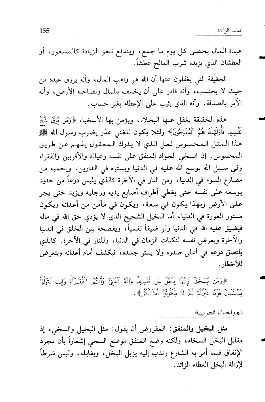 الهيئة الثانية: تشبيه هيئة البخيل الذي غلبه الشح فلم يستطع علاج نفسه الحريصة، بل كلما هم أو فكر في الصدقة غلبه الشح وضاق صدره وزاد خوفه وحرصه، بهيئة من يبدأ لبس ثوب من حلقات حديدية، يتجمع الثوب حول رقبته وعلى أعلى صدره، كلما هم بتوسعته أو مده أو بسطه لا يقوى على ذلك، بل تزداد الحلقات انكماشا، وضغطا على صدره، والتصاقا بجسده، بهذا يتعرض البخيل لعذاب الله، وينكشف أمام معاصيه، ويودي بنفسه إلى النار، كما ينكشف من لا يستره درعه، ويمكن منه عدوه.