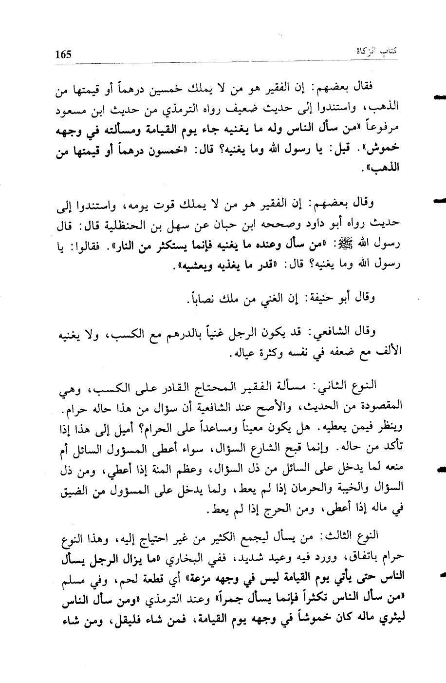 النوع الثاني: مسألة الفقير المحتاج القادر على الكسب، وهي المقصودة من الحديث، والأصح عند الشافعية أن سؤال من هذا حاله حرام. وينظر فيمن يعطيه. هل يكون معينا ومساعدا على الحرام؟ أميل إلى هذا إذا تأكد من حاله. وإنما قبح الشارع السؤال، سواء أعطى المسئول السائل أم منعه لما يدخل على السائل من ذل السؤال، وعظم المنة إذا أعطي، ومن ذل السؤال والخيبة والحرمان إذا لم يعط، ولما يدخل على المسئول من الضيق في ماله إذا أعطى، ومن الحرج إذا لم يعط.