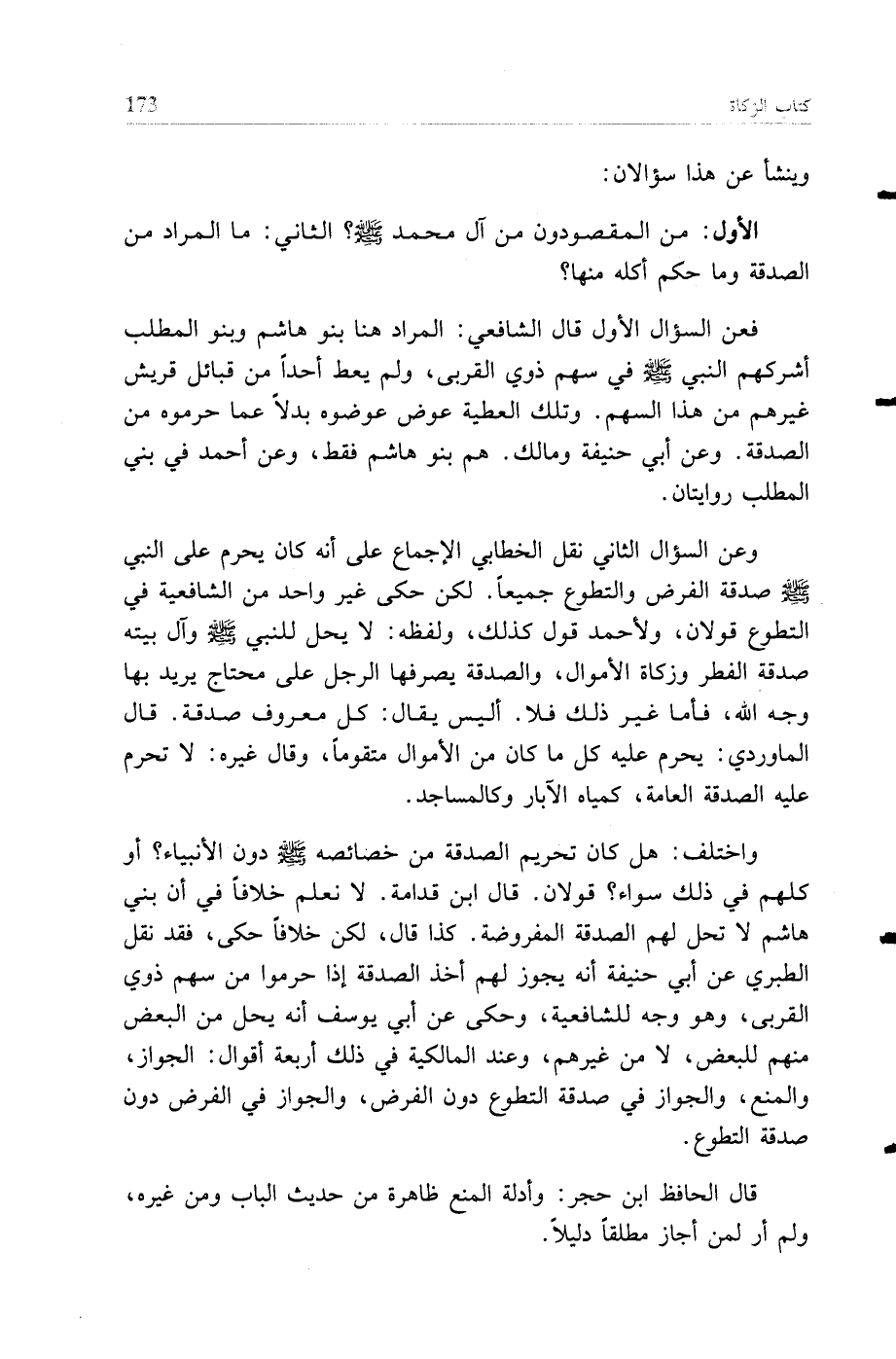 وعن السؤال الثاني نقل الخطابي الإجماع على أنه كان يحرم على النبي صلى الله عليه وسلم صدقة الفرض والتطوع جميعا. لكن حكى غير واحد من الشافعية في التطوع قولان، ولأحمد قول كذلك، ولفظه: لا يحل للنبي صلى الله عليه وسلم وآل بيته صدقة الفطر وزكاة الأموال. والصدقة يصرفها الرجل على محتاج يريد بها وجه الله، فأما غير ذلك فلا. أليس يقال: كل معروف صدقة. قال الماوردي: يحرم عليه كل ما كان من الأموال متقوما، وقال غيره: لا تحرم عليه الصدقة العامة، كمياه الآبار وكالمساجد.