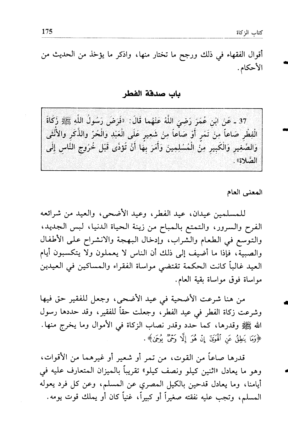 37 - عن ابن عمر رضي الله عنهما قال: "فرض رسول الله صلى الله عليه وسلم زكاة الفطر صاعا من تمر أو صاعا من شعير على العبد والحر والذكر والأنثى والصغير والكبير من المسلمين وأمر بها أن تؤدى قبل خروج الناس إلى الصلاة".