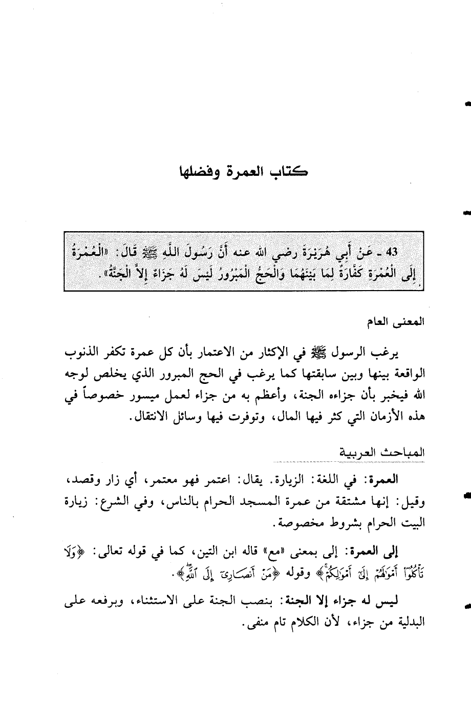 43 - عن أبي هريرة رضي الله عنه أن رسول الله صلى الله عليه وسلم قال: "العمرة إلى العمرة كفارة لما بينهما والحج المبرور ليس له جزاء إلا الجنة".