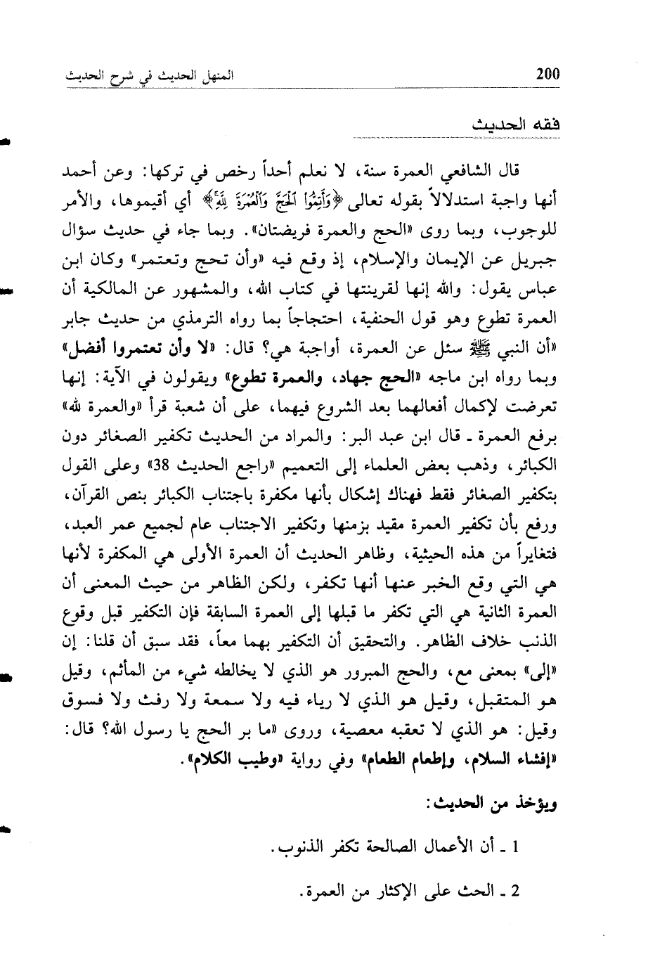 قال الشافعي العمرة سنة، لا نعلم أحدا رخص في تركها: وعن أحمد أنها واجبة استدلالا بقوله تعالى {وأتموا الحج والعمرة لله} أي أقيموها، والأمر للوجوب، وبما روي "الحج والعمرة فريضتان". وبما جاء في حديث سؤال جبريل عن الإيمان والإسلام، إذ وقع فيه "وأن تحج وتعتمر" وكان ابن عباس يقول: والله إنها لقرينتها في كتاب الله، والمشهور عن المالكية أن العمرة تطوع وهو قول الحنفية، احتجاجا بما رواه الترمذي من حديث جابر "أن النبي صلى الله عليه وسلم سئل عن العمرة، أواجبة هي؟ قال: لا وأن تعتمروا أفضل" وبما رواه ابن ماجه" الحج جهاد، والعمرة تطوع" ويقولون في الآية: إنها تعرضت لإكمال أفعالهما بعد الشروع فيهما، على أن شعبة قرأ "والعمرة لله" برفع العمرة -قال ابن عبد البر: والمراد من الحديث تكفير الصغائر دون الكبائر، وذهب بعض العلماء إلى التعميم "راجع الحديث 38" وعلى القول بتكفير الصغائر فقط فهناك إشكال بأنها مكفرة باجتناب الكبائر بنص القرآن، ورفع بأن تكفير العمرة مقيد بزمنها وتكفير الاجتناب عام لجميع عمر العبد، فتغايرا من هذه الحيثية، وظاهر الحديث أن العمرة الأولى هي المكفرة لأنها هي التي وقع الخبر عنها أنها تكفر، ولكن الظاهر من حيث المعنى أن العمرة الثانية هي التي تكفر ما قبلها إلى العمرة السابقة فإن التكفير قبل وقوع الذنب خلاف الظاهر. والتحقيق أن التكفير بهما معا، فقد سبق أن قلنا: إن "إلى" بمعنى مع، والحج المبرور هو الذي لا يخالطه شيء من المأثم، وقيل هو المتقبل، وقيل هو الذي لا رياء فيه ولا سمعة ولا رفث ولا فسوق وقيل: هو الذي لا تعقبه معصية، وروي "ما بر الحج يا رسول الله؟ قال: إفشاء السلام، وإطعام الطعام" وفي رواية "وطيب الكلام".