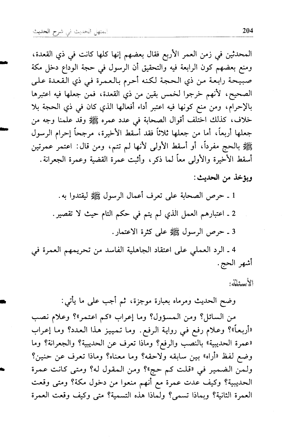 المحدثين في زمن العمر الأربع فقال بعضهم إنها كلها كانت في ذي القعدة، ومنع بعضهم كون الرابعة فيه والتحقيق أن الرسول في حجة الوداع دخل مكة صبيحة رابعة من ذي الحجة لكنه أحرم بالعمرة في ذي القعدة على الصحيح، لأنهم خرجوا لخمس بقين من ذي القعدة، فمن جعلها فيه اعتبرها بالإحرام، ومن منع كونها فيه اعتبر أداء أفعالها الذي كان في ذي الحجة بلا خلاف، كذلك اختلف أقوال الصحابة في عدد عمره صلى الله عليه وسلم وقد علمنا وجه من جعلها أربعا، أما من جعلها ثلاثا فقد أسقط الأخيرة، مرجحا إحرام الرسول صلى الله عليه وسلم بالحج مفردا، أو أسقط الأولى لأنها لم تتم، ومن قال: اعتمر عمرتين أسقط الأخيرة والأولى معا لما ذكر، وأثبت عمرة القضية وعمرة الجعرانة.
