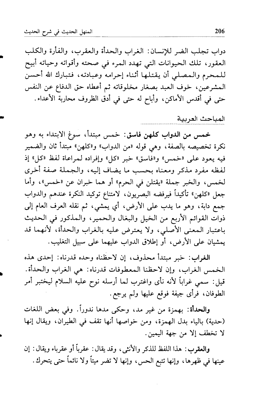 (خمس من الدواب كلهن فاسق) خمس مبتدأ، سوغ الابتداء به وهو نكرة تخصيصه بالصفة، وهي قوله "من الدواب" و"كلهن" مبتدأ ثان والضمير فيه يعود على "خمس" و"فاسق" خبر "كل" وإفراده لمراعاة لفظ "كل" إذ لفظه مفرد مذكر ومعناه بحسب ما يضاف إليه، والجملة صفة أخرى لخمس، والخبر جملة "يقتلن في الحرم" أو هما خبران عن "خمس"، وأما جعل "كلهن" تأكيدا فيرفضه البصريون، لامتناع توكيد النكرة عندهم والدواب جمع دابة، وهو ما يدب على الأرض، أي يمشي، ثم نقله العرف العام إلى ذوات القوائم الأربع من الخيل والبغال والحمير، والمذكور في الحديث باعتبار المعنى الأصلي، ولا يعترض عليه بالغراب والحدأة، لأنهما قد يمشيان على الأرض، أو إطلاق الدواب عليهما على سبيل التغليب.