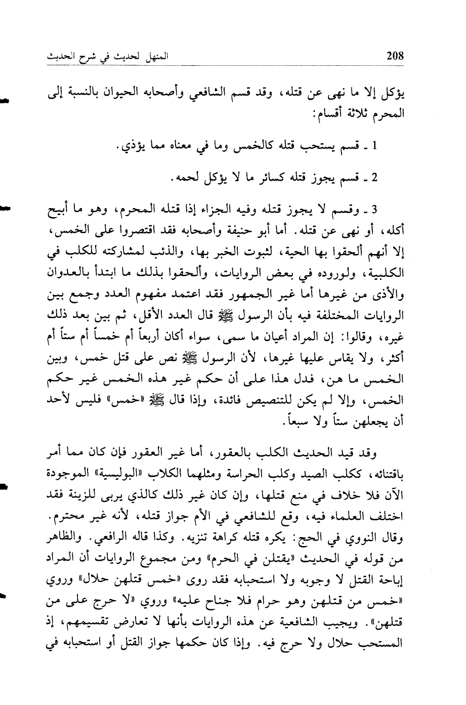 3 - وقسم لا يجوز قتله وفيه الجزاء إذا قتله المحرم، وهو ما أبيح أكله، أو نهي عن قتله. أما أبو حنيفة وأصحابه فقد اقتصروا على الخمس، إلا أنهم ألحقوا بها الحية، لثبوت الخبر بها، والذئب لمشاركته للكلب في الكلبية، ولوروده في بعض الروايات، وألحقوا بذلك ما ابتدأ بالعدوان والأذى من غيرها أما غير الجمهور فقد اعتمد مفهوم العدد وجمع بين الروايات المختلفة فيه بأن الرسول صلى الله عليه وسلم قال العدد الأقل، ثم بين بعد ذلك غيره، وقالوا: إن المراد أعيان ما سمى، سواء أكان أربعا أم خمسا أم ستا أم أكثر، ولا يقاس عليها غيرها، لأن الرسول صلى الله عليه وسلم نص على قتل خمس، وبين الخمس ما هن، فدل هذا على أن حكم غير هذه الخمس غير حكم الخمس، وإلا لم يكن للتنصيص فائدة، وإذا قال صلى الله عليه وسلم "خمس" فليس لأحد أن يجعلهن ستا ولا سبعا.