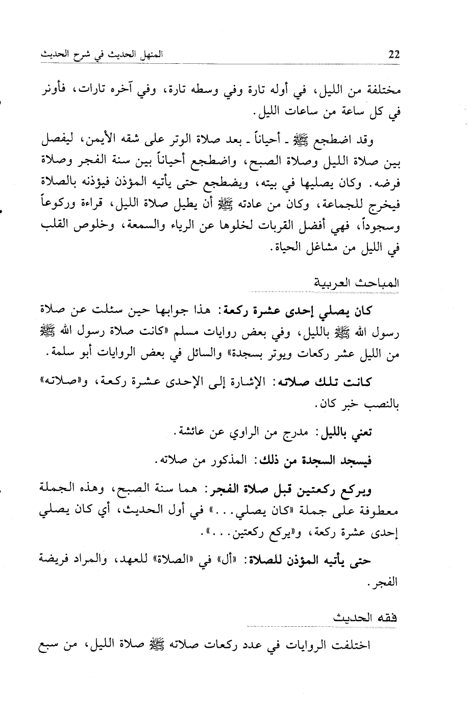(كان يصلي إحدى عشرة ركعة) هذا جوابها حين سئلت عن صلاة رسول الله صلى الله عليه وسلم بالليل وفي بعض روايات مسلم "كانت صلاة رسول الله صلى الله عليه وسلم من الليل عشر ركعات ويوتر بسجدة" والسائل في بعض الروايات أبو سلمة