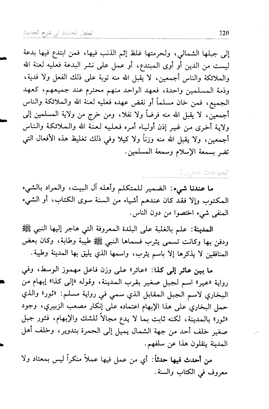 إلى جبلها الشمالي، ولحرمتها غلظ إثم الذنب فيها، فمن ابتدع فيها بدعة ليست من الدين أو أوى المبتدع، أو عمل على نشر البدعة فعليه لعنة الله والملائكة والناس أجمعين، لا يقبل الله منه توبة على ذلك الفعل ولا فدية، وذمة المسلمين واحدة، فعهد الواحد منهم محترم عند جميعهم، كعهد الجميع، فمن خان مسلما أو نقض عهده فعليه لعنة الله والملائكة والناس أجمعين، لا يقبل الله منه فرضا ولا نفلا، ومن خرج من ولاية المسلمين إلى ولاية أخرى من غير إذن أولياء أمره فعليه لعنة الله والملائكة والناس أجمعين، ولا يقبل الله منه وزنا ولا كيلا وفي ذلك تغليظ هذه الأفعال التي تضر بسمعة الإسلام وسمعة المسلمين.
