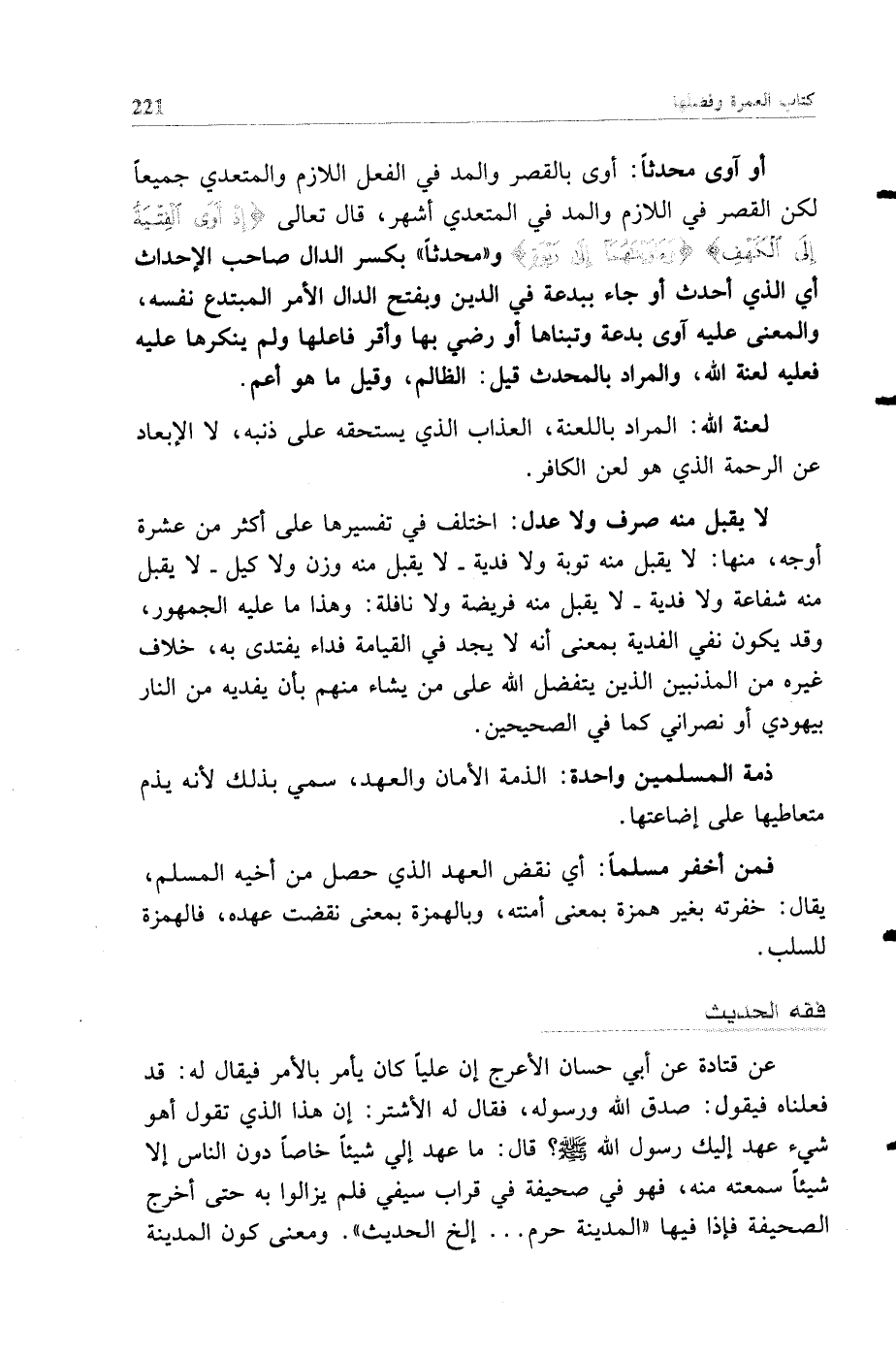 (لا يقبل منه صرف ولا عدل) اختلف في تفسيرها على أكثر من عشرة أوجه، منها: لا يقبل منه توبة ولا فدية- لا يقبل منه وزن ولا كيل- لا يقبل منه شفاعة ولا فدية- لا يقبل منه فريضة ولا نافلة: وهذا ما عليه الجمهور، وقد يكون نفي الفدية بمعنى أنه لا يجد في القيامة فداء يفتدي به، خلاف غيره من المذنبين الذين يتفضل الله على من يشاء منهم بأن يفديه من النار بيهودي أو نصراني كما في الصحيحين.