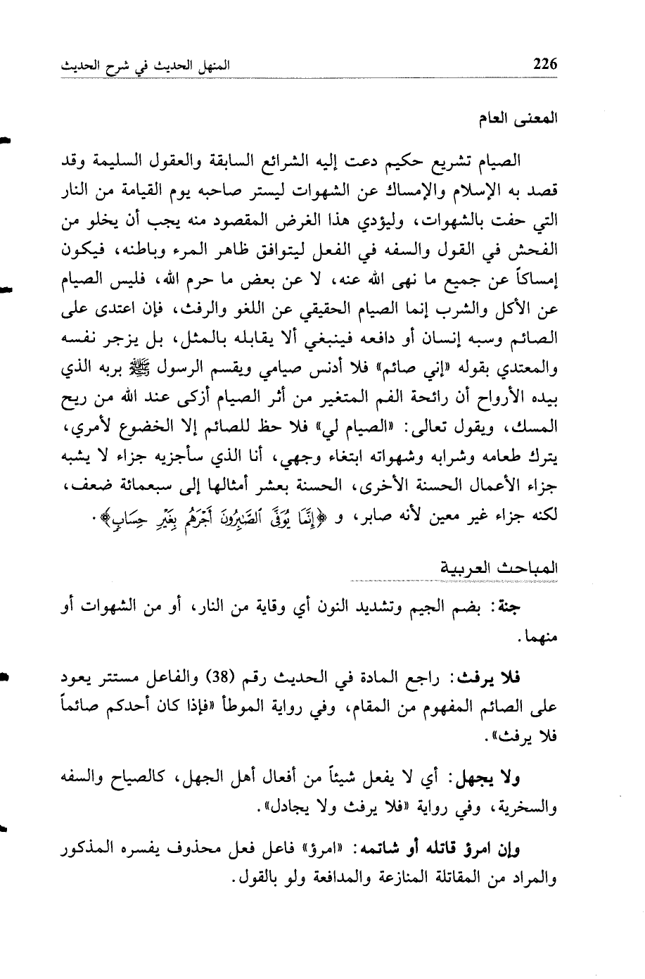 الصيام تشريع حكيم دعت إليه الشرائع السابقة والعقول السليمة وقد قصد به الإسلام الإمساك عن الشهوات ليستر صاحبه يوم القيامة من النار التي حفت بالشهوات، وليؤدي هذا الغرض المقصود منه يجب أن يخلو من الفحش في القول والسفه في الفعل ليتوافق ظاهر المرء وباطنه، فيكون إمساكا عن جميع ما نهى الله عنه، لا عن بعض ما حرم الله، فليس الصيام عن الأكل والشرب إنما الصيام الحقيقي عن اللغو والرفث، فإن اعتدى على الصائم وسبه إنسان أو دافعه فينبغي ألا يقابله بالمثل، بل يزجر نفسه والمعتدي بقوله "إني صائم" فلا أدنس صيامي ويقسم الرسول صلى الله عليه وسلم بربه الذي بيده الأرواح أن رائحة الفم المتغير من أثر الصيام أزكى عند الله من ريح المسك، ويقول تعالى: "الصيام لي" فلا حظ للصائم إلا الخضوع لأمري، يترك طعامه وشرابه وشهواته ابتغاء وجهي، أنا الذي سأجزيه جزاء لا يشبه جزاء الأعمال الحسنة الأخرى، الحسنة بعشر أمثالها إلى سبعمائة ضعف، لكنه جزاء غير معين لأنه صابر، و {إنما يوفى الصابرون أجرهم بغير حساب.}